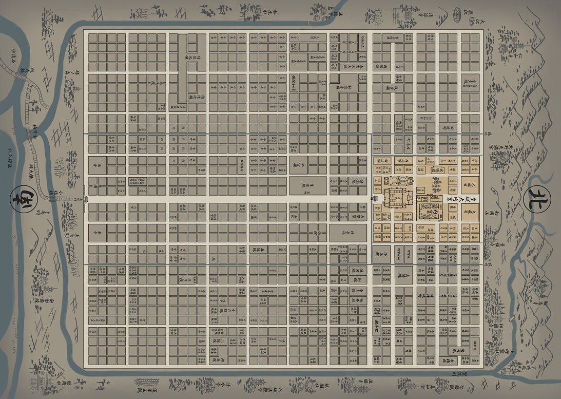 平安京を大路(白い太線)で区切れば、バックギャモンと同じ12マス×12マスになります。
