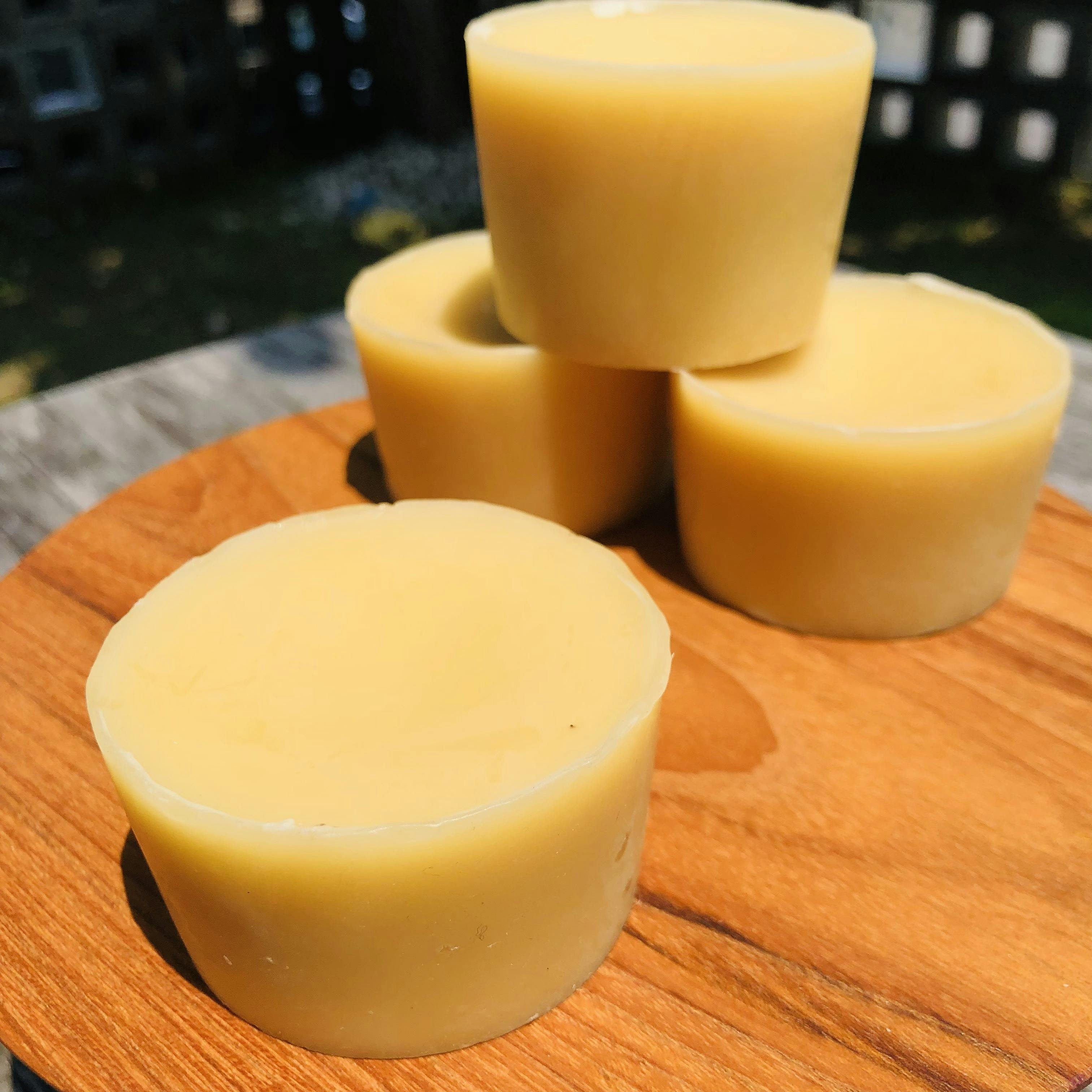 神埼市の脊振山麓の植物から、はらまき養蜂場のミツバチが集めた国産ミツロウを、太陽光で時間をかけて溶かし、手作業で4回ほど精製を繰り返しできあがった、たまご色のミツロウです。丁寧な精製により、ミツロウの自然由来の効能、香りをそのまま残しています。