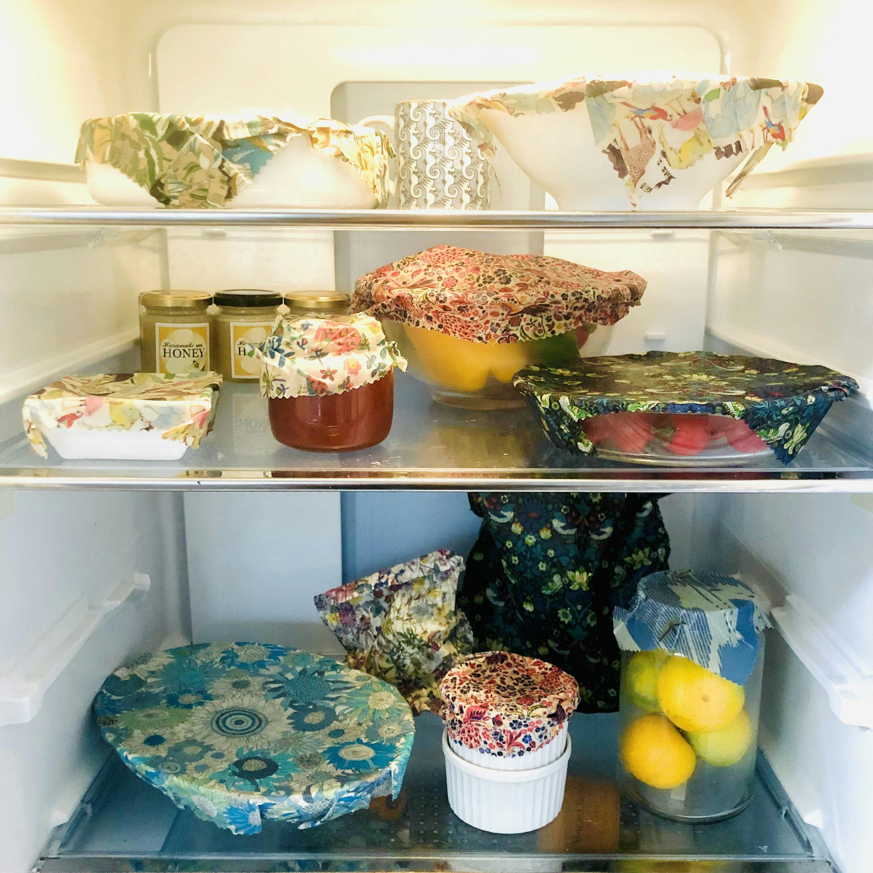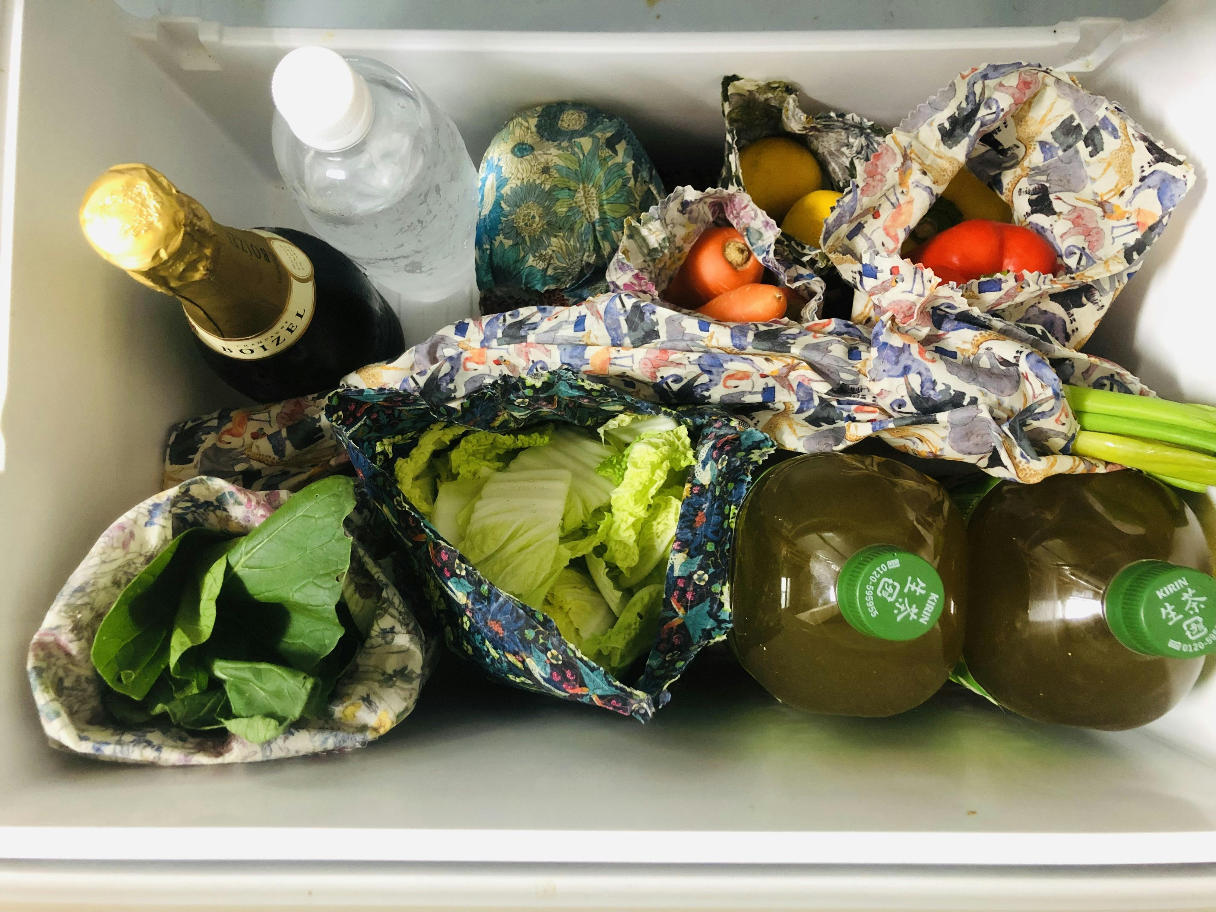 このようにミツロウバッグに入れたものを、冷蔵庫にしまうとスッキリと収納できます。
