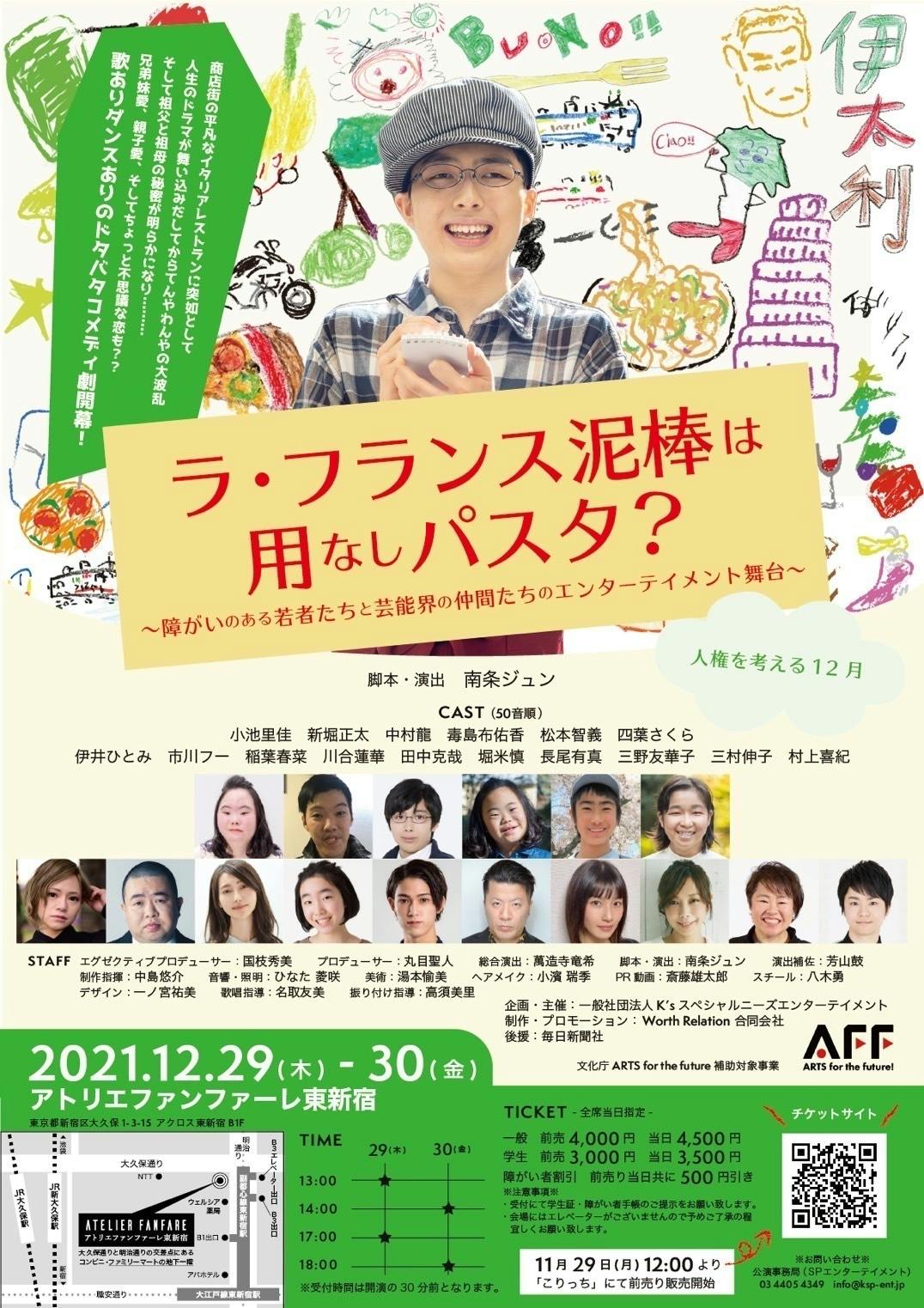 プロデューサーの国枝秀美はこの活動を立ち上げて15年になります(前社含む)。現役のアーティストである芸能界の仲間たちが講師となり、歌やダンス、演技の指導をしています。そして、ドラマや映画に出演する機会を設けたりしながら、国際障がい者デーや障がい者週間の有る12月に「人権を考える12月」として舞台公演を開催して来ました。