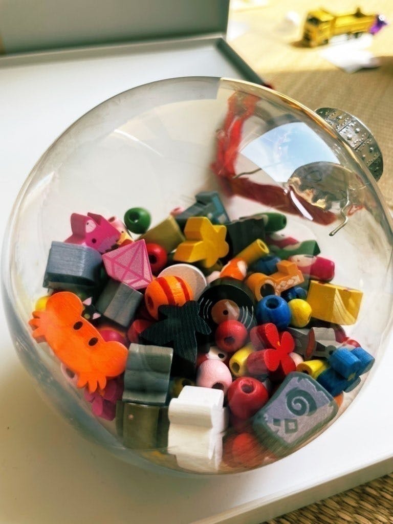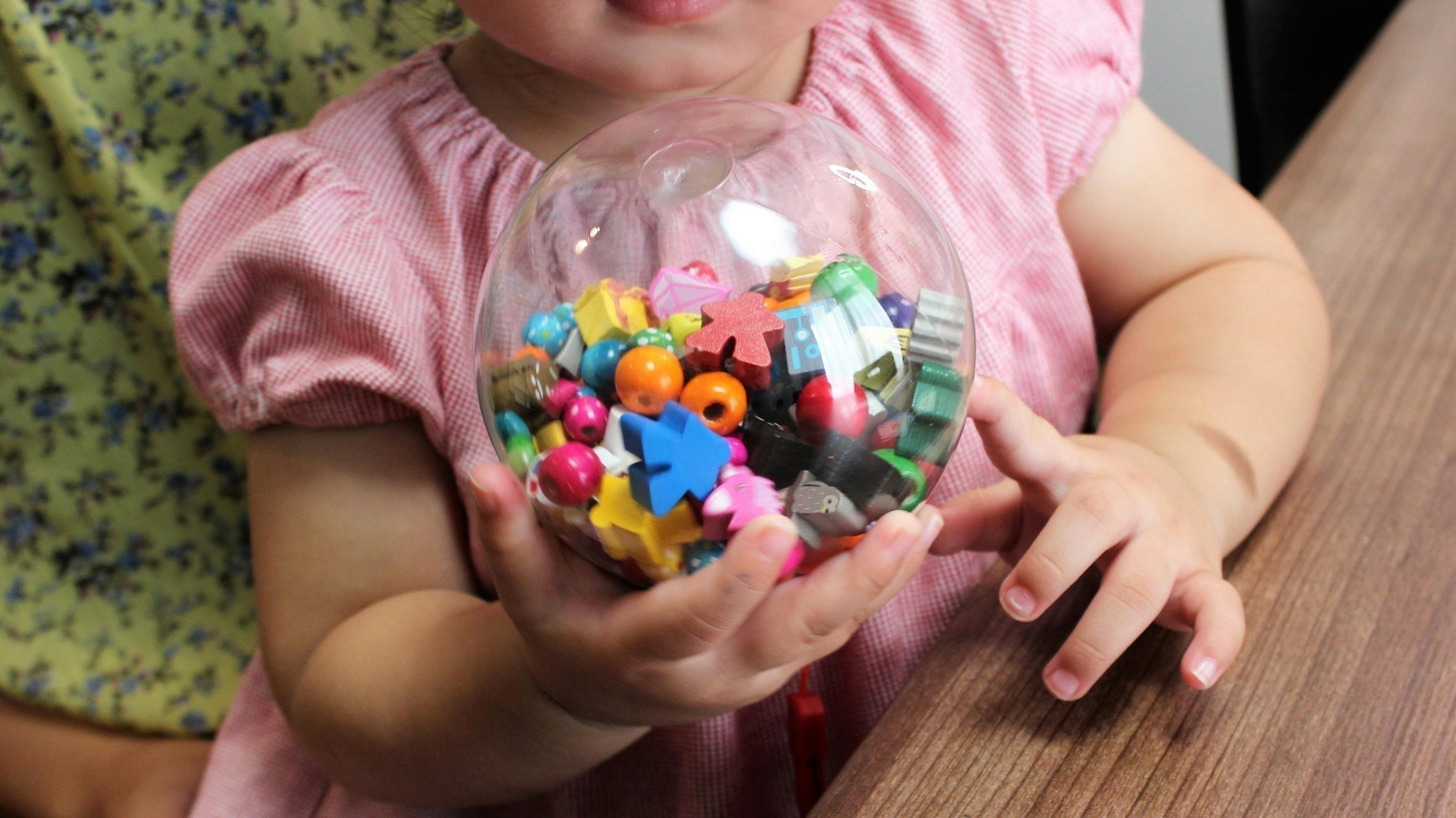 また、誤飲のリスクをなくすために細かなコマはすべて直接は触れられないように、直径10cmのボールの中へ封入し、見た目の可愛さとしゃかしゃかして遊べる形が実現できました。2歳未満でもボールだけであれば、ラトルとして使うこともできるようなデザインを目指しました。