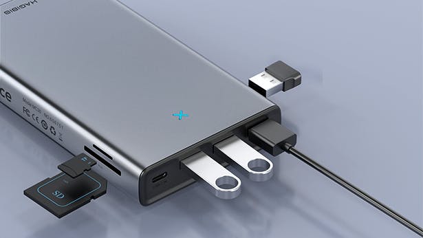 USBメモリ、マウス、スマホ、Wi-Fiレシーバー、SDカードなどを同時にパソコンにつなぎたい時も、7つのポートを搭載したHAGIBIS MCドッキングステーションがあれば全て解決。作業効率がぐっとアップします。