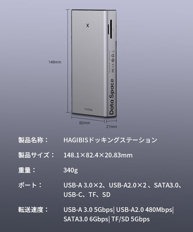 「HAGIBIS」(ハギビス)はノートパソコンやタブレットなど、いつも使うデバイスのストレージを楽々大きく拡張できるドッキングステーションです。もう重くて遅いポータブルハードディスクを持ち歩く必要はありません。HAGIBISの転送速度は最大500Mb/sで、市場で最も普及している2.5インチのSSDとHDDに対応。デバイスに接続して6つのポートを使用でき、仕事も遊びもより速く、より効率的に処理できます。