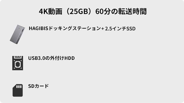 転送速度はHDDポータブルハードディスクのなんと約5倍。例えば4K画質の映画1本(50GB)なら、わずか2分で転送完了です。