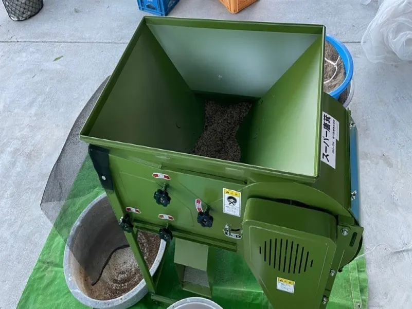 これは唐箕(とうみ)という機械です。穀粒に交じっている異物を除去する優秀な機械です。風を送り比重の重いごまと軽い不完全な未熟なごま等のゴミを分別します。