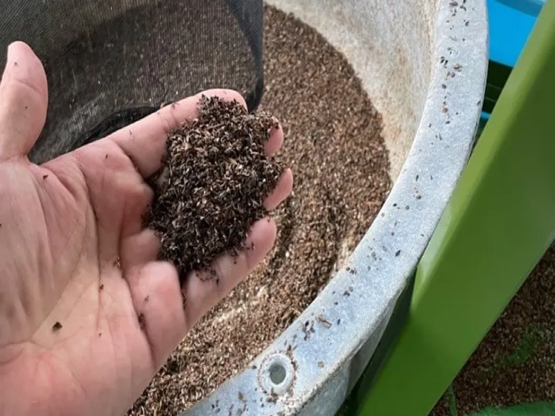 棒で叩いて脱穀し、ごまになります。まだ初期段階なのでゴミがたくさん入っています。次の作業で殻やゴミを取り除いていきます。この作業を完全にゴミがなくなるまで何度も繰り返し行います。