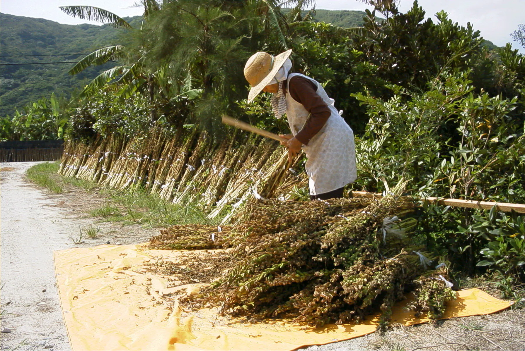 脱穀は棒などで、結束したごまの茎を叩きます。その際、ごまが地面に落ちないよう下にネットを引いて行います。喜界島では、この作業を手作業で行っています。叩く量が多いため、非常に過酷な作業です。