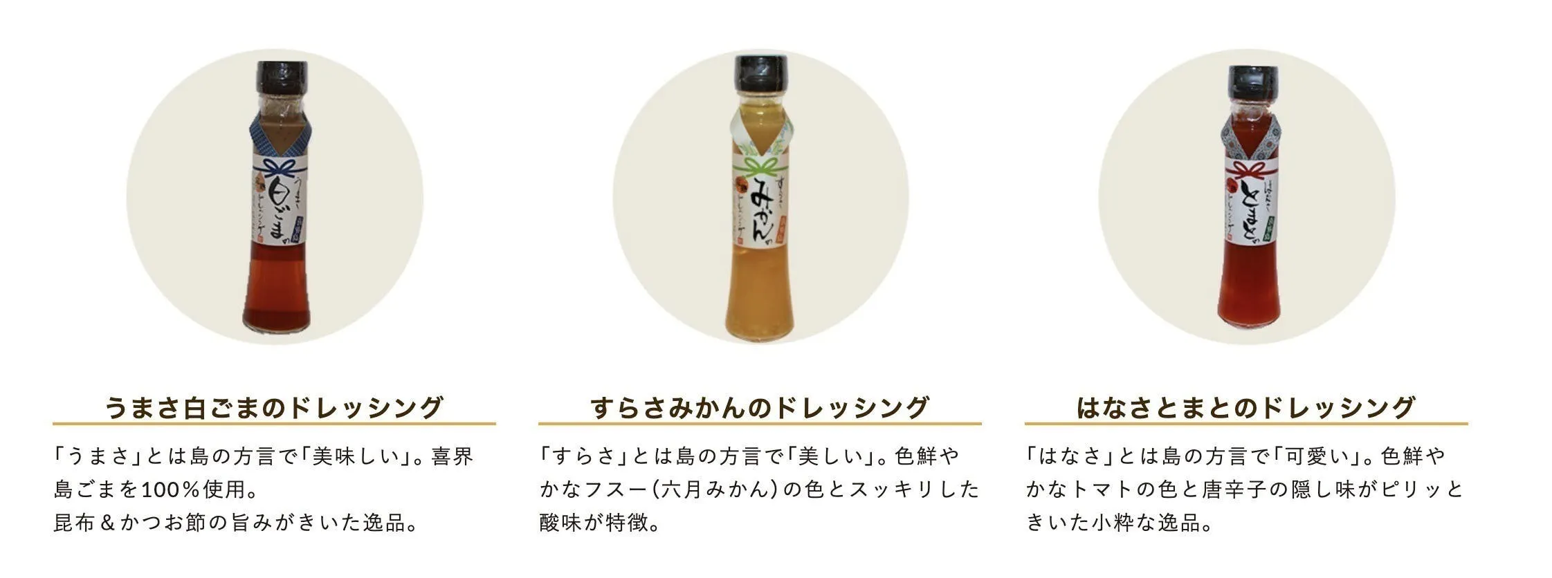 ・うまさ白ごまのドレッシング ・すらさみかんのドレッシング ・はなさとまとのドレッシング