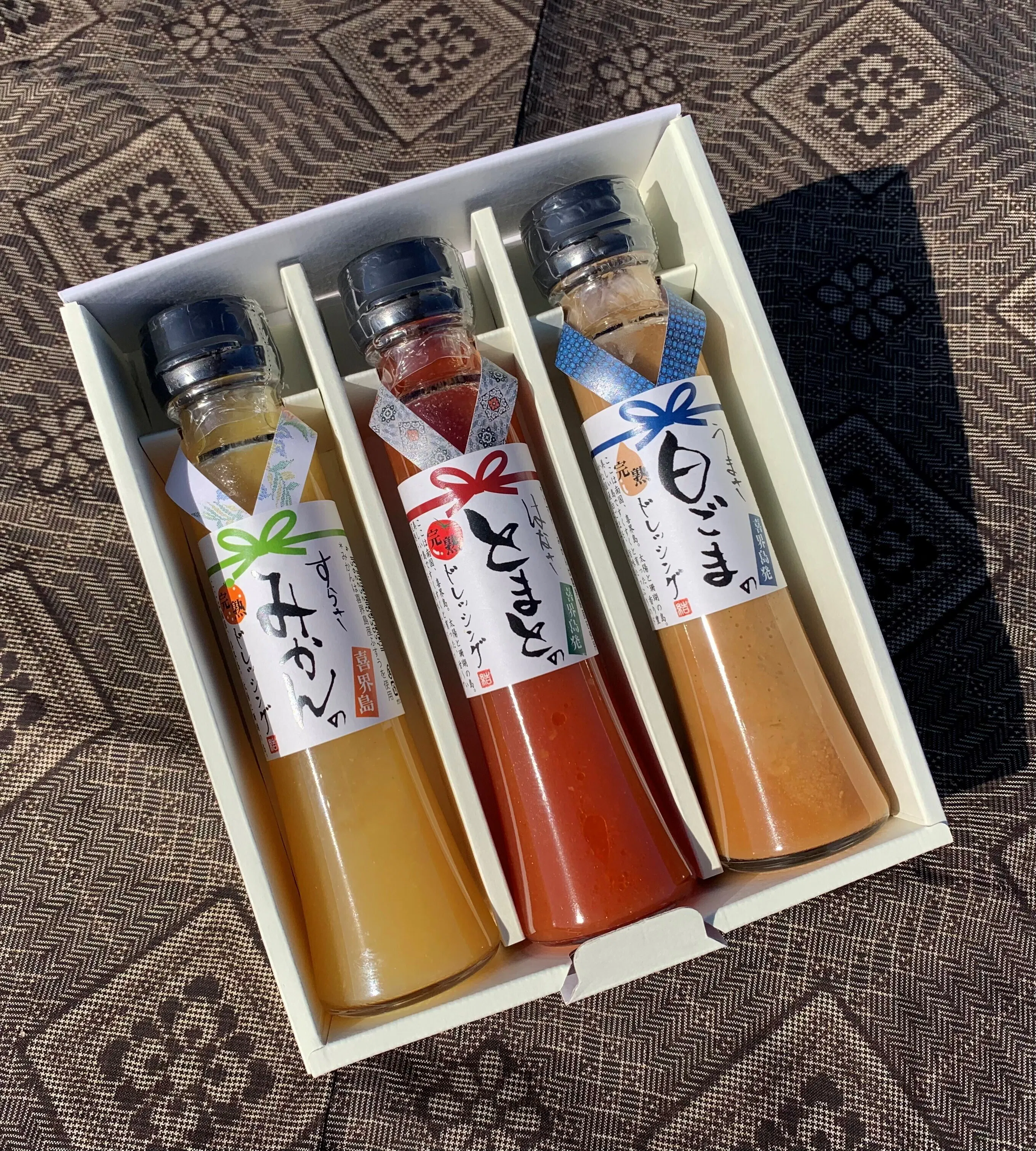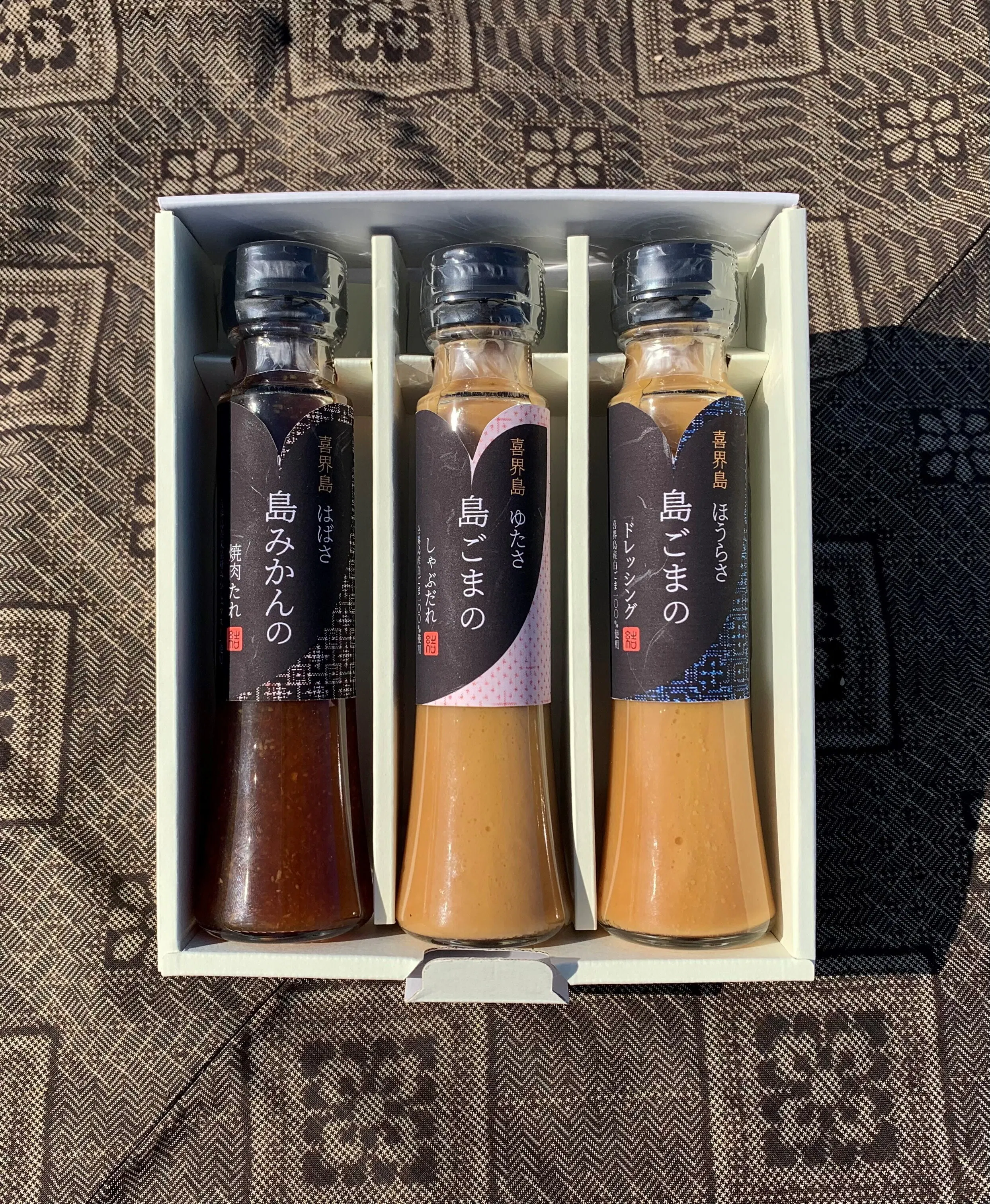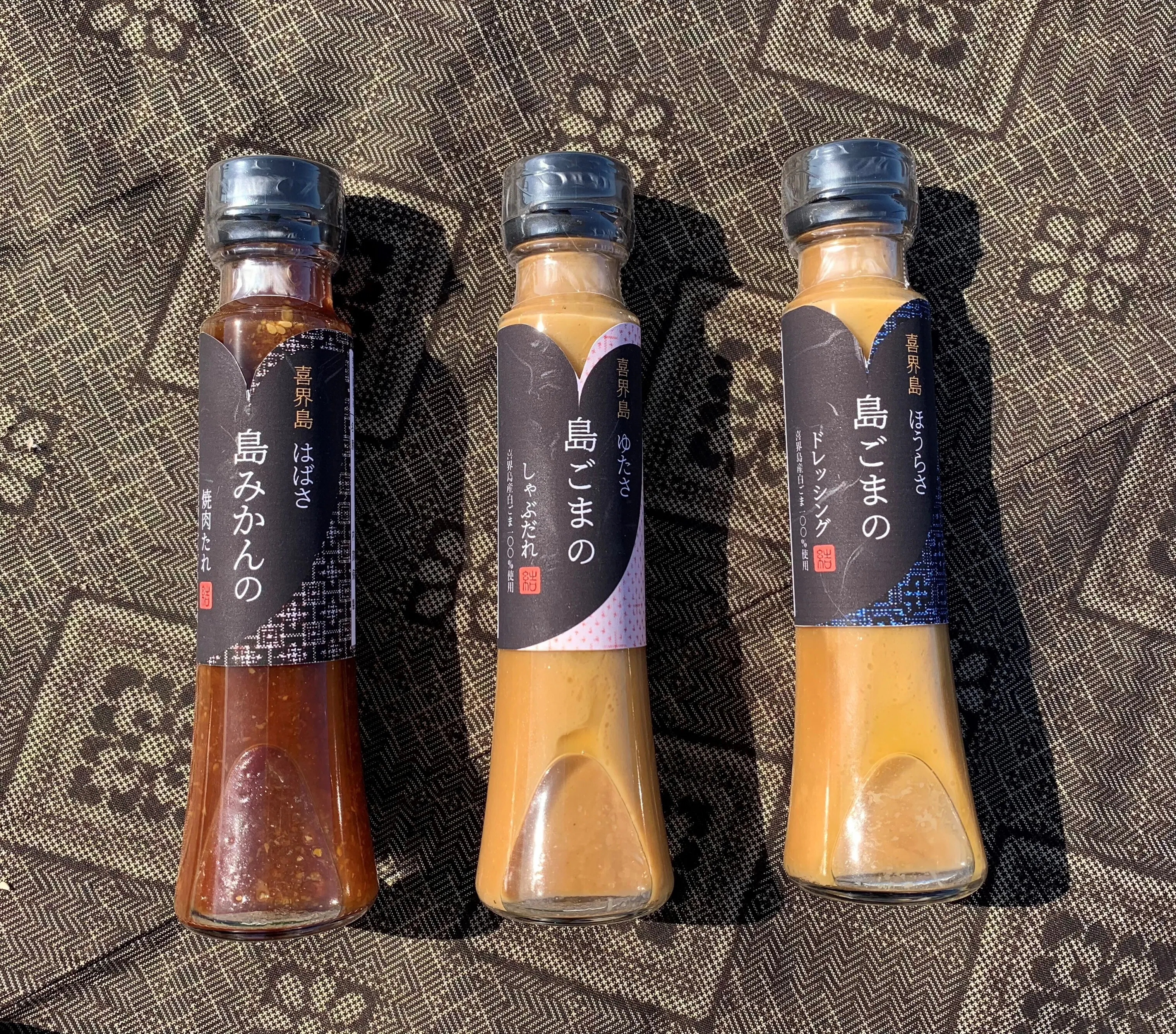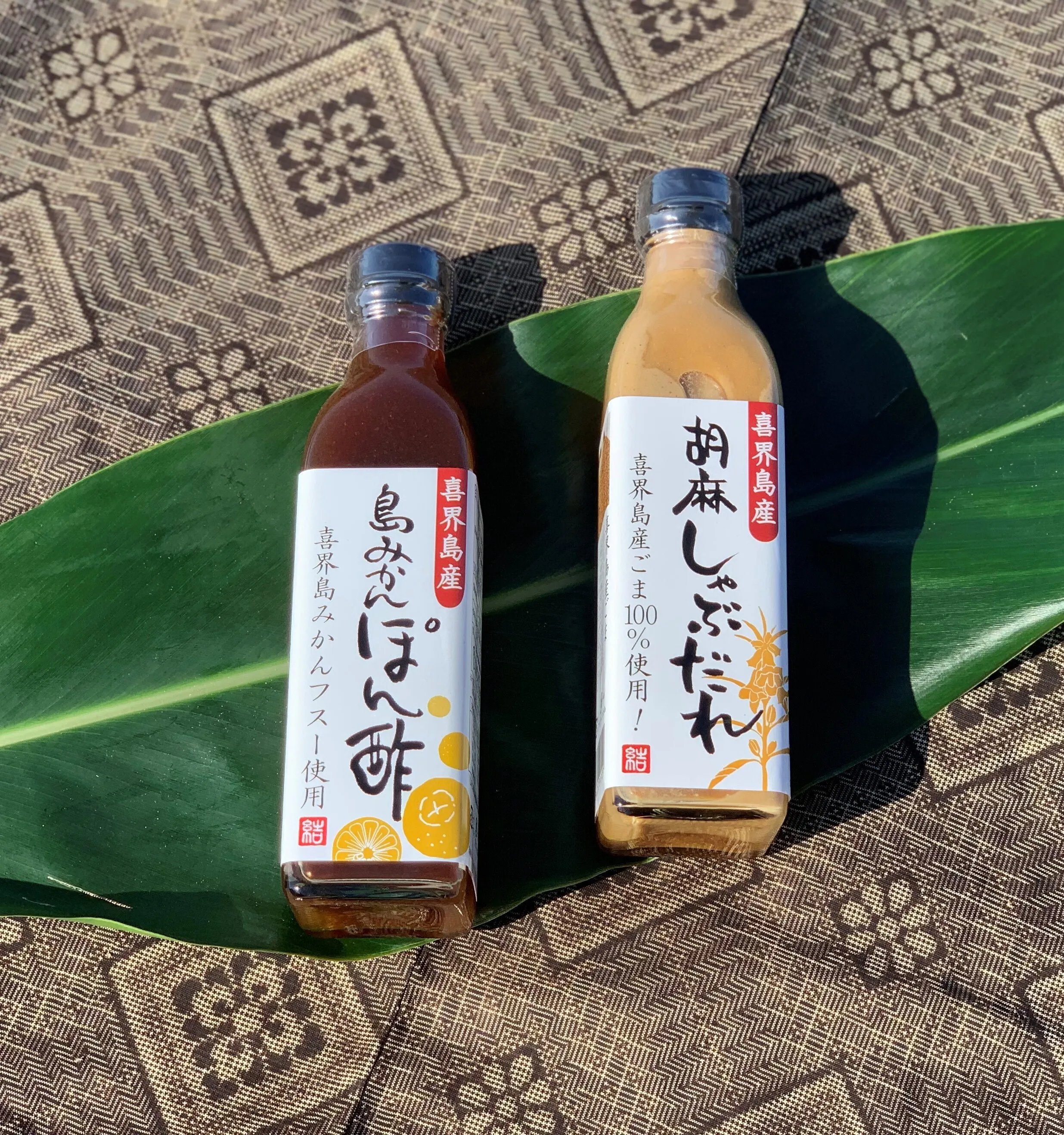 今回私たちが新商品として提案させていただくのは、紬美人シリーズ第2弾となる『喜界島産白ごま』をふんだんに使用した『胡麻特選セット』の「ゆたさ島ごまのしゃぶだれ」と「ほうらさ島ごまのドレッシング」、「はばさ島みかんの焼肉たれ」です。