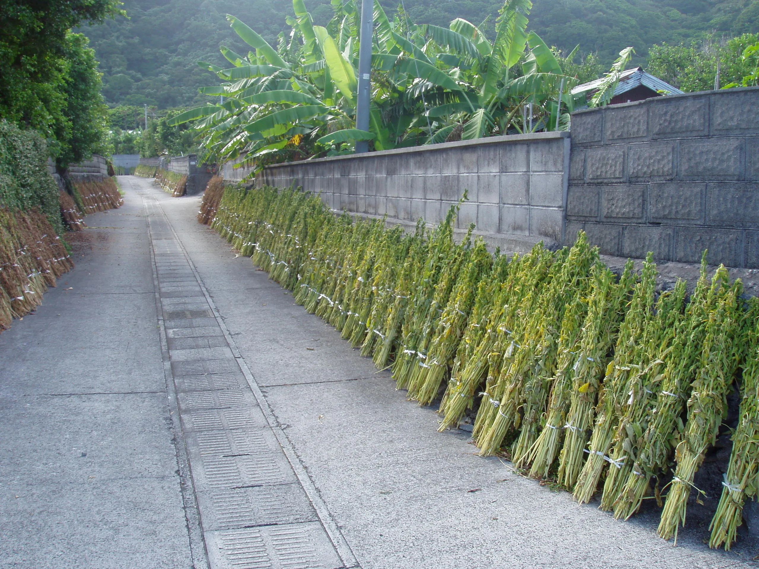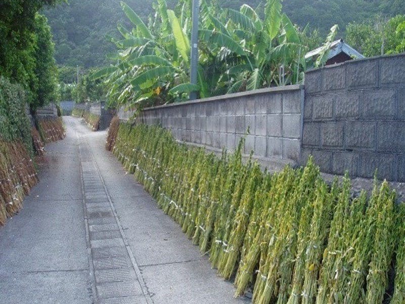 7月から10月ごろの収穫時期になると、収穫したごまを束ね穂を上にして立て、鞘が茶色になるまで10日ほど乾燥させます。島じゅうあちこちの道沿いに天日干しする様子がこの時期の喜界島の風物詩。通称「セサミストリート」と呼ばれる、この時期、この島でしか見られない風景です。