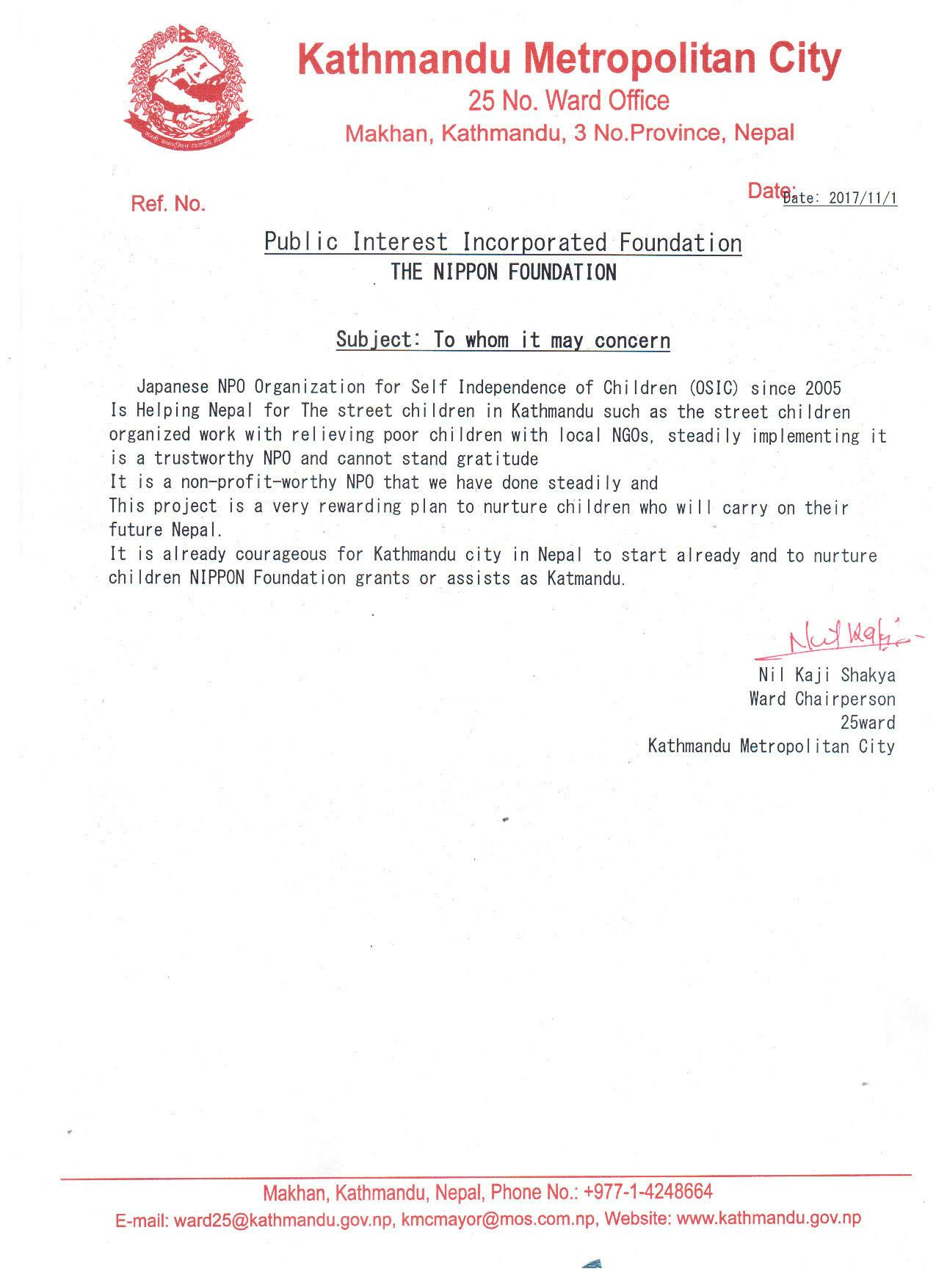 カトマンズ区長(ニルカンジ氏)から、