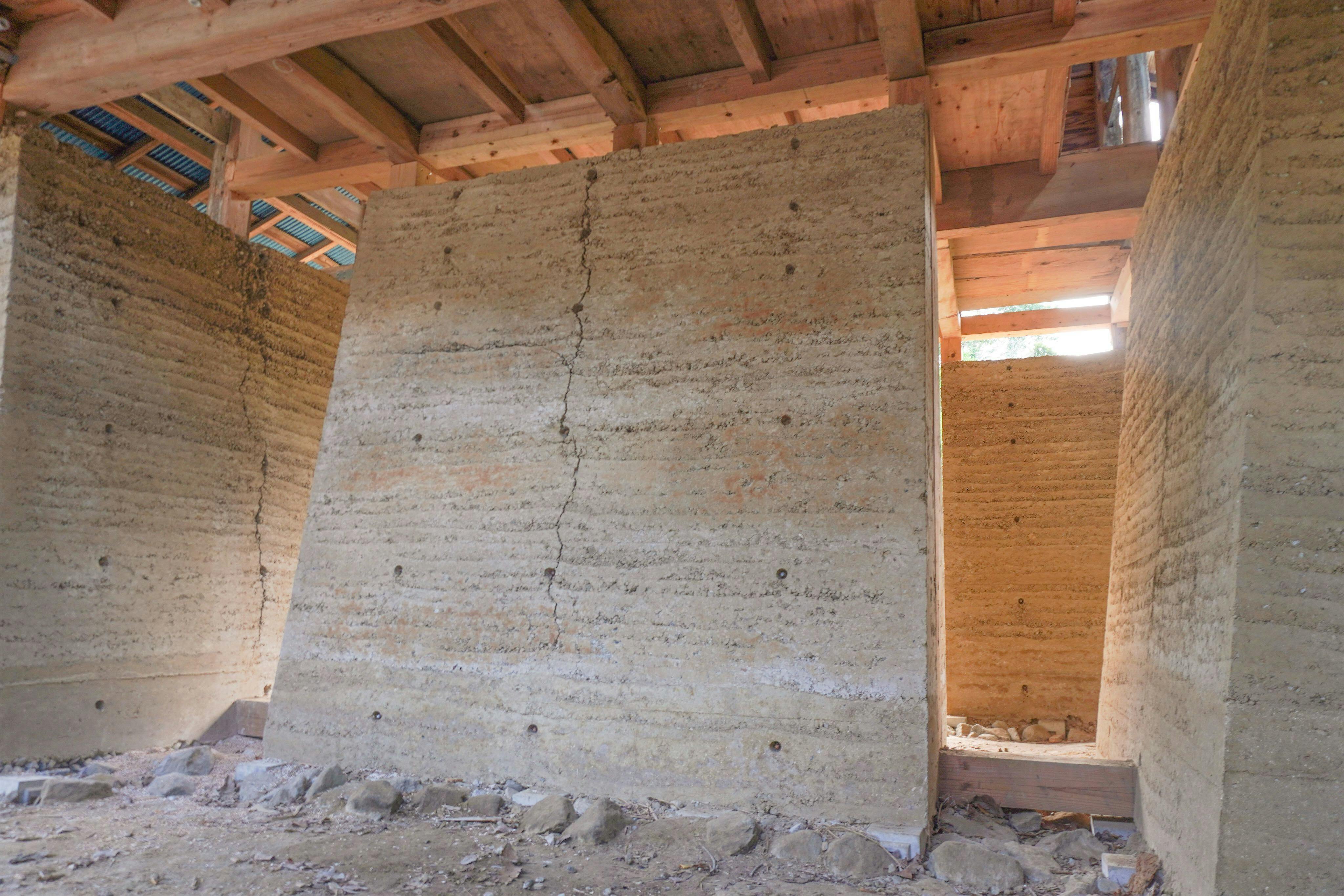 型枠に入れて強く突き固めることで、頑丈な土の壁をつくります。単純な一方で、繊細な工法でもあります。実は水分の量や配合比率は非常に繊細で絶妙なバランスで成り立っていることも、実践してみるとよくわかりました。水分量が多いとひび割れの原因になったりと、苦労しました。