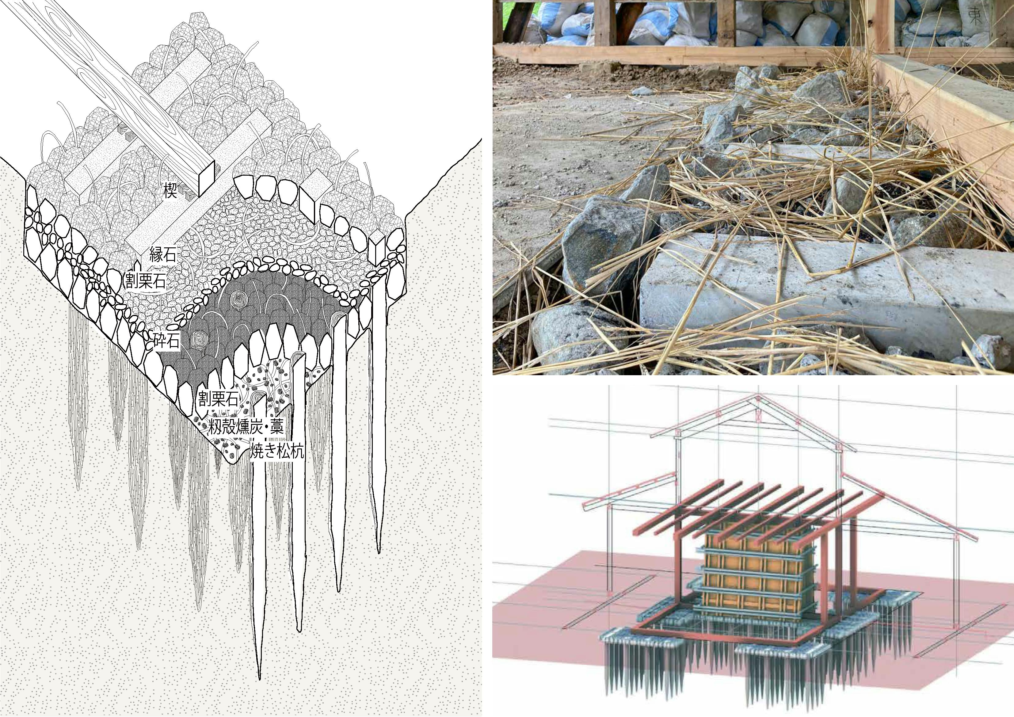 日本を代表して国内外で活躍されている左官職人である久住さんには、私たちへ「版築」という構法を発案していただき、実際の施工の際には現地でアドバイスをしていただきました。特に、版築の土の配合は久住さんの経験則による配合で決定しています。左官素人の私たちに土の扱い方から叩き方までご教授いただきました。そのほか、ゼネコンである浅沼組の皆さんには、地業・基礎や版築型枠の設計段階でエスキスをしていただり、八幡工業の皆さん、KSAGの境さんには、左官の道具やミキサーの支援をしていただきました。高田造園の高田さんには、土中環境改善の手法についてワークショップの参加や本を通して学ばせていただき、基礎や雨落ちの設計・施工で実践致しました。また、塩原さん・山本さんには、杭の打ち方や割栗石の小端立て方をご教授いただき、私たち素人でも施工できるようになりました。
