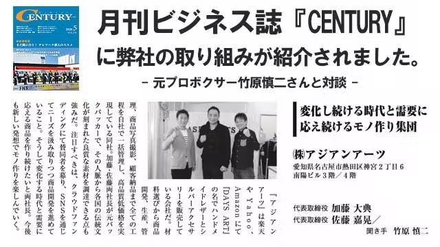 弊社の取り組みが評価され、月間ビジネス誌『CENTURY』2020年に掲載されました。元プロボクサー竹原慎二さんとビジネス対談させてい頂きました。