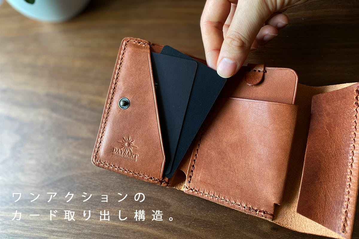 3つ折り構造のお財布ですが、展開後すぐにメインカードにアクセスが可能です。