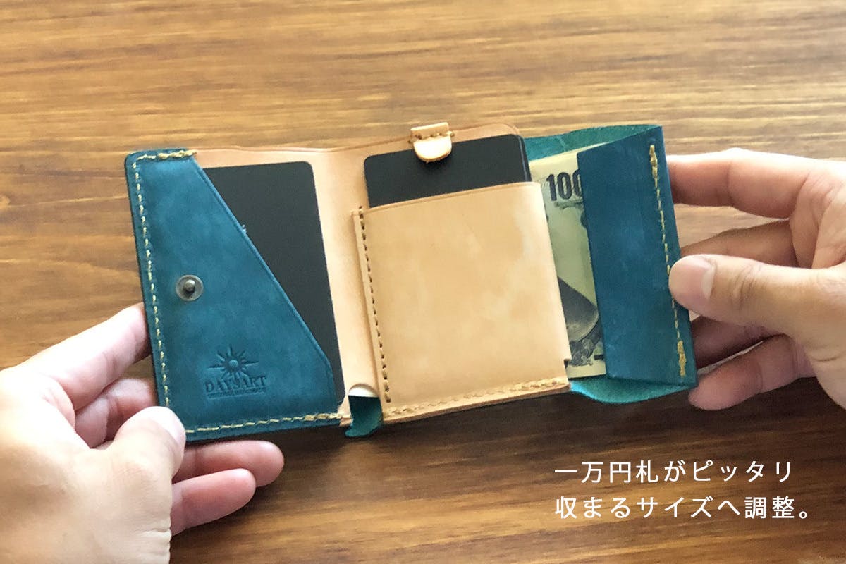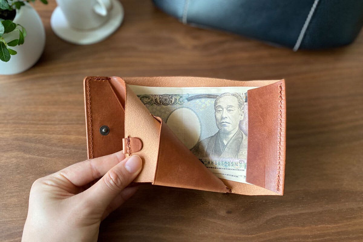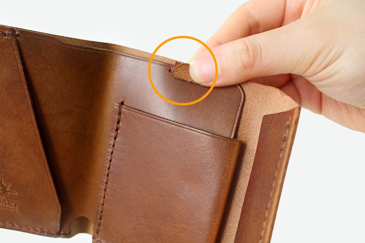 また、革をへり返しストッパーとすることでお札の抑えとして機能し、10000円札も1000円札も飛び出す事なく収納が可能です。お札を使う際はへり返し部分を180度以上曲げて頂くをとお札がパサパサッと飛び出てくる構造です。