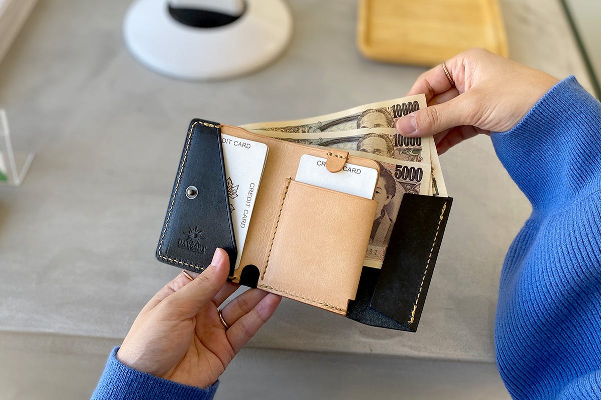 お財布を3つ折り構造にすることで、お札を折り曲げずに収納できるようになりました。