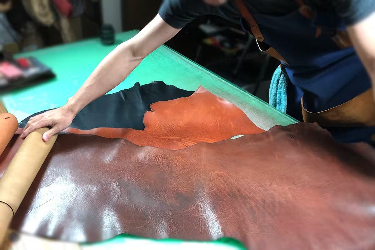 植物タンニンなめしには珍しいパステルカラーをラインアップしたマヤベリーはオイルをしっかりと含み切り口まで美しい我々制作サイドでも一押しの革となります。