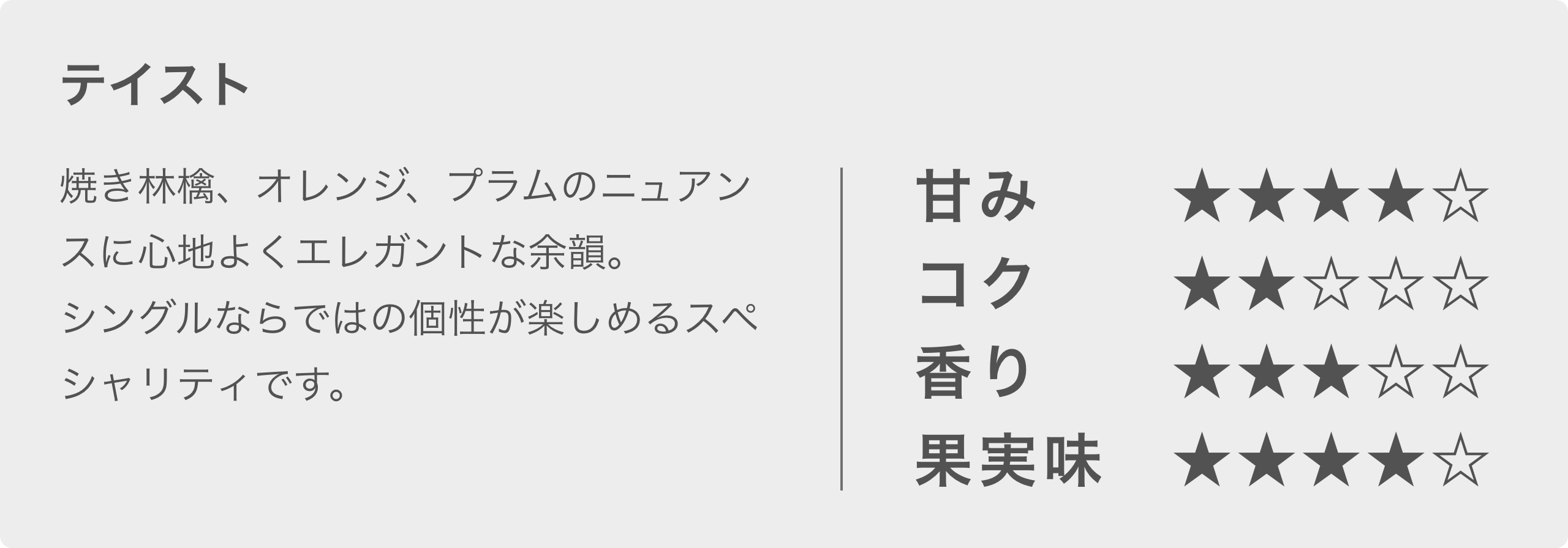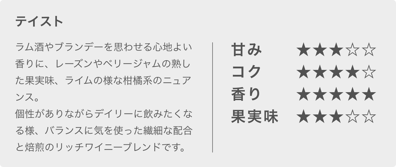 ラムやブランデー等の洋酒を思わせる芳香。レーズンやベリージャムの熟した果実味に、ライムの様な甘さと苦味。ブレンドならではの味の重なり。強い洋酒の香りだけでなくデイリーに飲みたくなるバランスに気を使った繊細な配合と焙煎です。