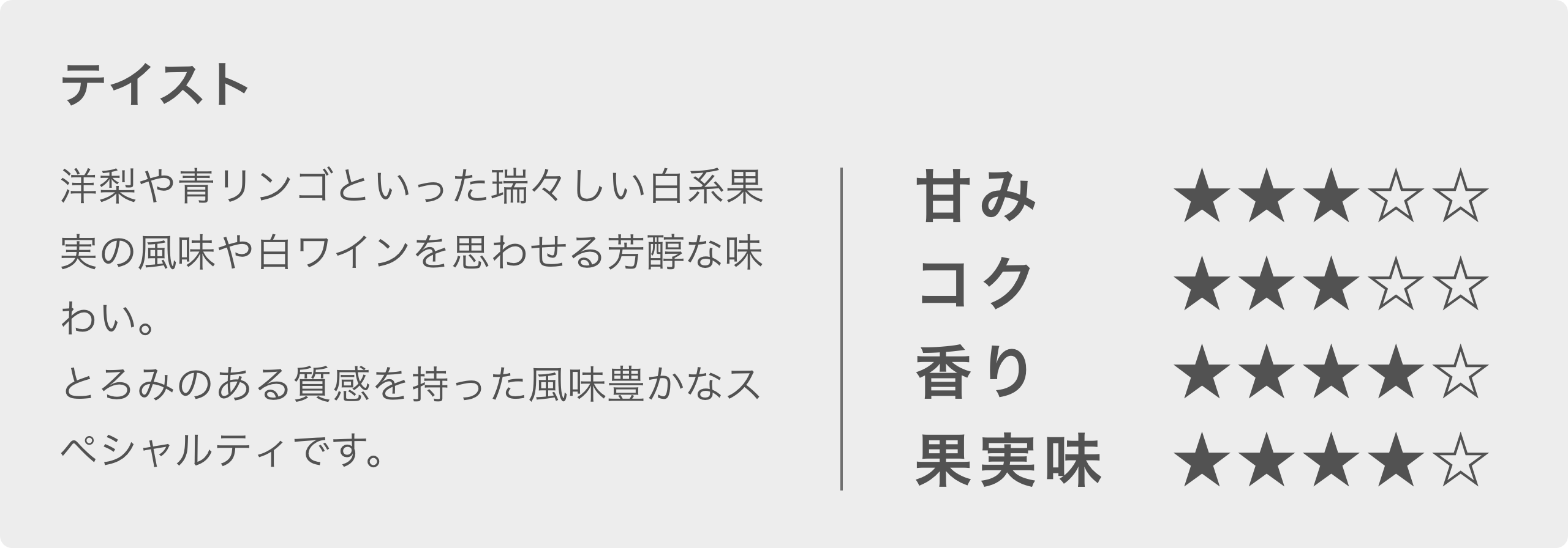 ペラルタコーヒーの所有する一つの農園であるエル・ボスケ農園で生産された当マイクロロットは、瑞々しい白系果実の風味や白ワインを思わせる芳醇なニュアンス。