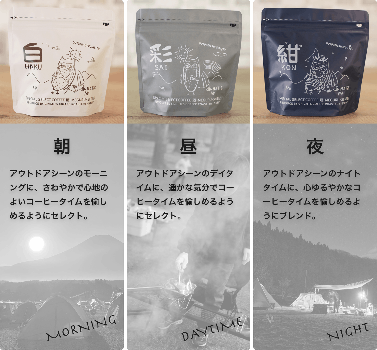 同じコーヒーを愉しむのもステキです。しかし、「時間帯別でアウトドア体験をより豊かにするコーヒーがあっても良いのではないか」、そんな衝動に駆られ、アウトドアの時間帯(朝/昼/夜)それぞれの機会のコーヒー時間をより一層豊かに愉しむための専用コーヒーをプロの焙煎士に相談し、企画・開発に挑みました。