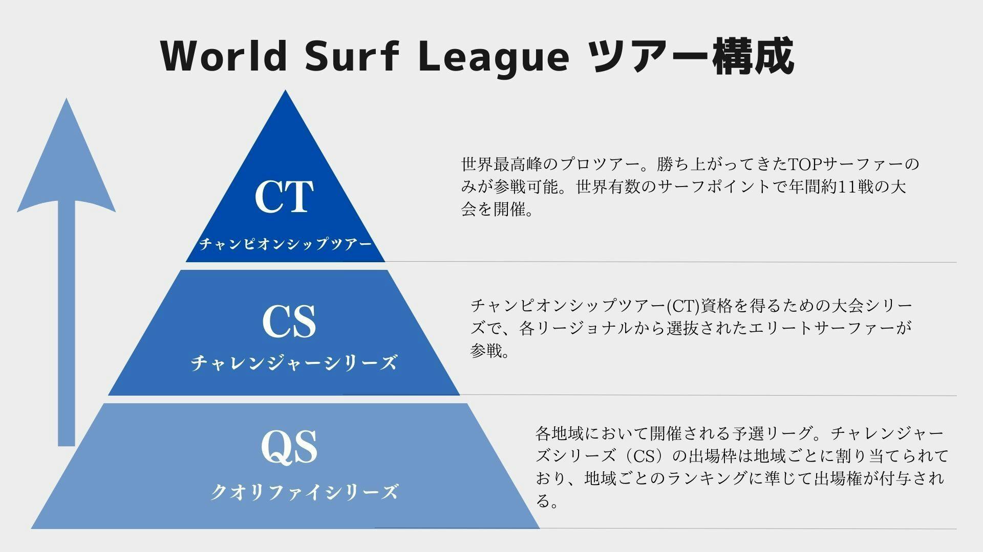 2020年東京オリンピックで初めて競技種目に選ばれたサーフィンですが、趣味として楽しむ人は多くても、競技としてサーフィンをしている人はまだまだ少なく、馴染みがないかもしれません。私が参加しているのは、世界サーフィン連盟(WSL)が主催する世界ツアーで、世界のトップサーファーが参戦する世界最高峰のステージです。