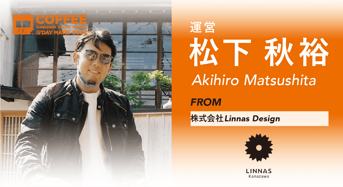 ホテルLINNAS Kanazawaを運営するLinnas Design Inc. 代表の松下秋裕です(ニックネームはアキ)。LINNASはホテルを点、地域を面と捉えており、私たちは点と面で「居心地の良い豊かな日常」を多くの人に届けたいと考え日々場の運営をしています。今回のイベントはNonstop Coffee Fumiさんのコーヒーへの熱い想いに共感し、また、まさに面での街の魅力を内外に発信する最高の機会だと思いFumiさんと実行委員会を組成することになりました。応援のほどよろしくお願いします!