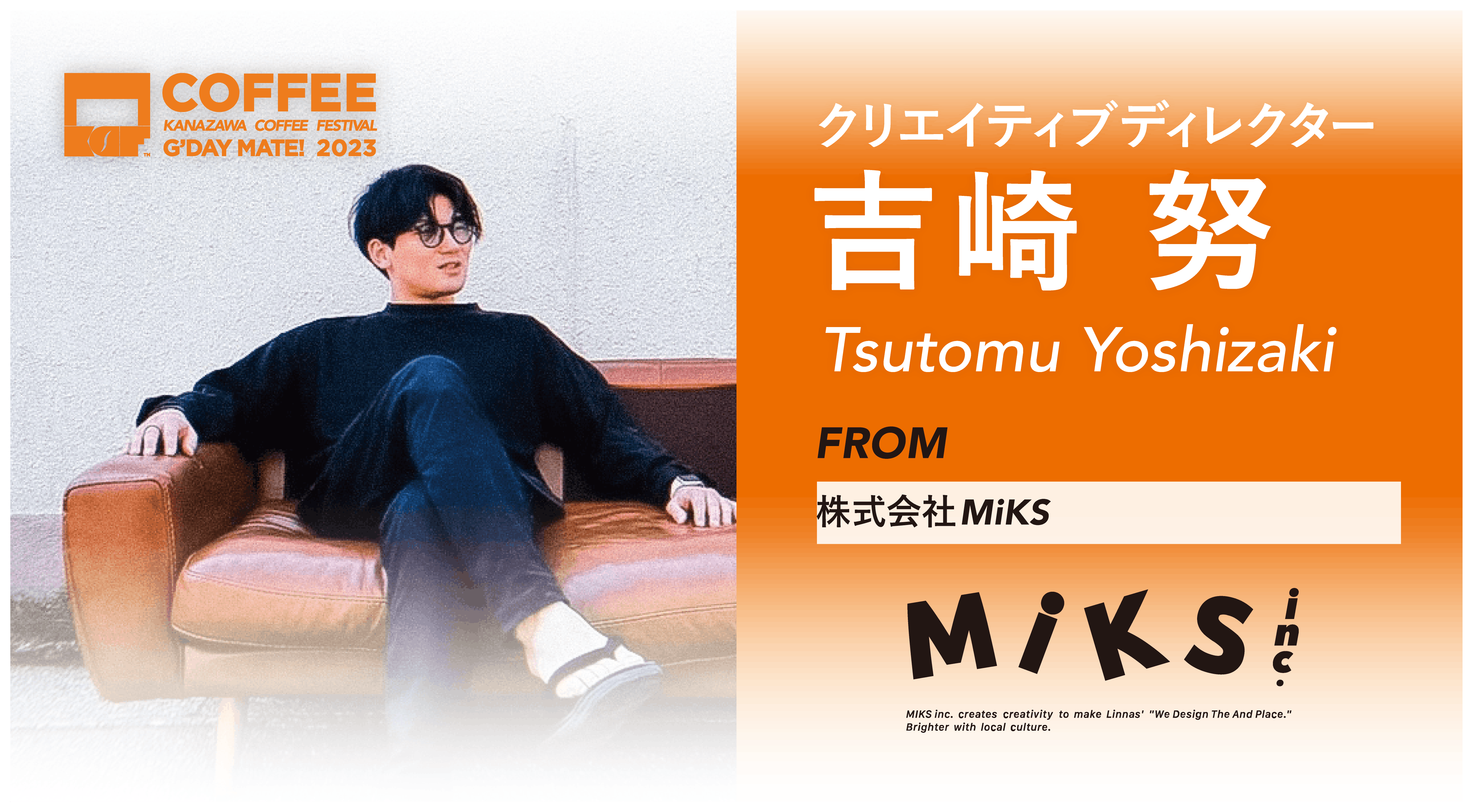 ローカル金沢から、ブランディングを主軸にデザインファームを運営している株式会社MiKS代表のざっけろーにこと吉崎努です。今回、金澤コーヒーフェスティバル2023では、ローカルデザイナーのMayungと一緒に全体のクリエイティブ制作・監修に努めています。