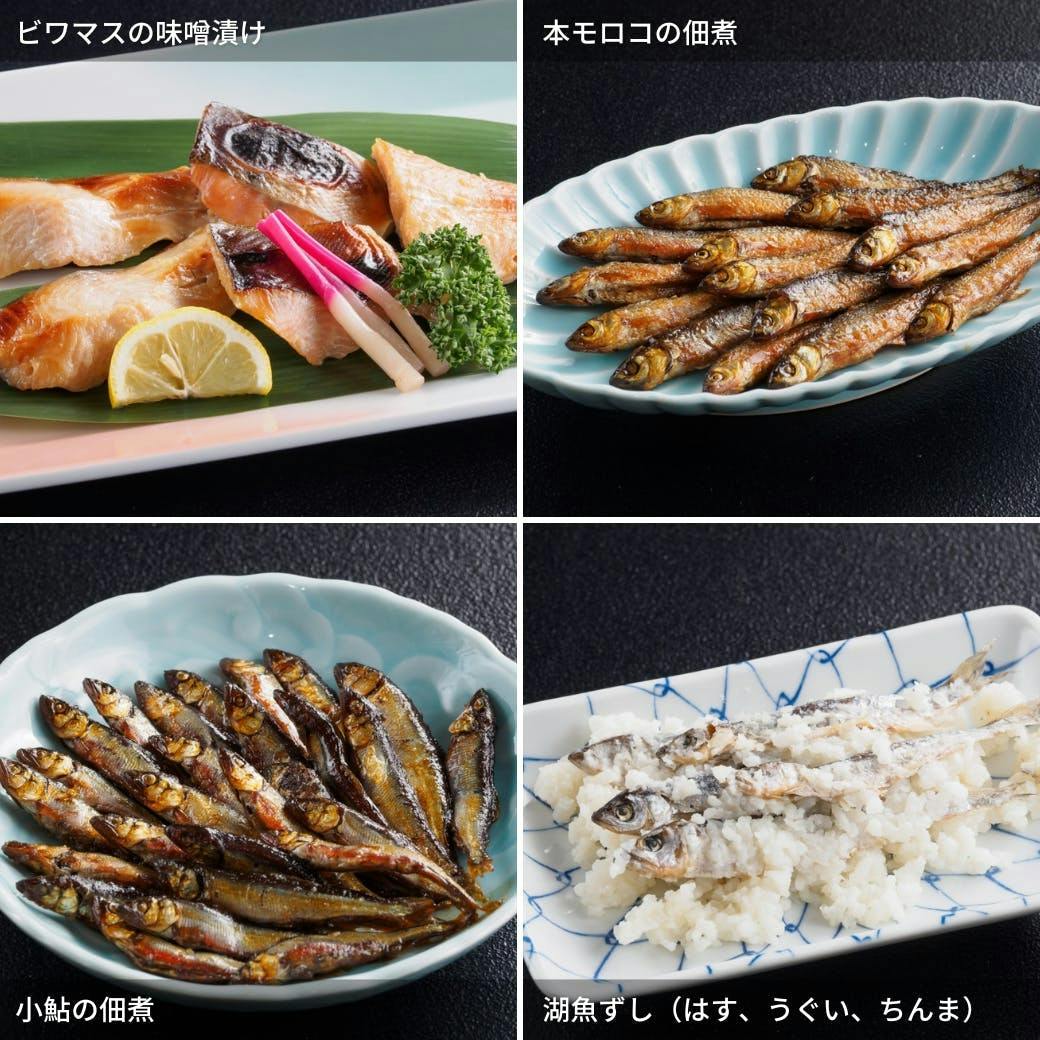 ※時期によって獲れる魚が違い、春にはコアユやニゴロブナ、夏はビワマス、秋はホンモロコ、冬は鴨鍋やギンブナなど、旬の魚が食べられます。