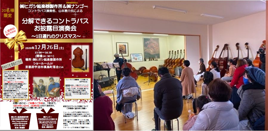 また、部品を完成させただけでは、本当の完成ではありません。楽器は音を奏でるのが本来の姿・・・。そこで2020年12月に「分解できるコントラバス」で演奏会を開催し、コロナ禍ではありましたが、お子さま連れのご家族、吹奏楽をやっているという学生さん、またコントラバス演奏者様等、沢山の方にお越し頂きました。そして、大型サイズ(高さ約180センチ)のコントラバスが分解できるという発想に多くの関心を持たれていたのだと、改めてコラボレーションに関われたことに感動を覚えるのでした。