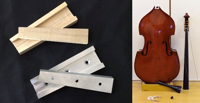 「コントラバスが分解できる???」少し耳を疑いたくなるかもしれませんが、コントラバスは高さ約180センチと大型楽器なので、「持ち運びに大変!」、「遠方の演奏会の時には現地でレンタルすることもあるけど自分の楽器で弾きたい」等、演奏者様からの声を形にしたいというヒガシ絃楽器製作所様の思いを形にしたものです。これには、弊社の設計者とヒガシ絃楽器製作所の東義教さんとの現物模型(木材)による打ち合わせ~弊社の強みリバースエンジニアリング技術~社内製造現場での部品加工により完成しました。しかし、木材模型を金属で作るのは初めてだったので、設計に時間がかかったり、部品は斜面同士のくさび形状の組み合わせになっているので、上手く2個の部品がはまるように微調整を幾度と繰り返す等、大変苦労して完成させました。