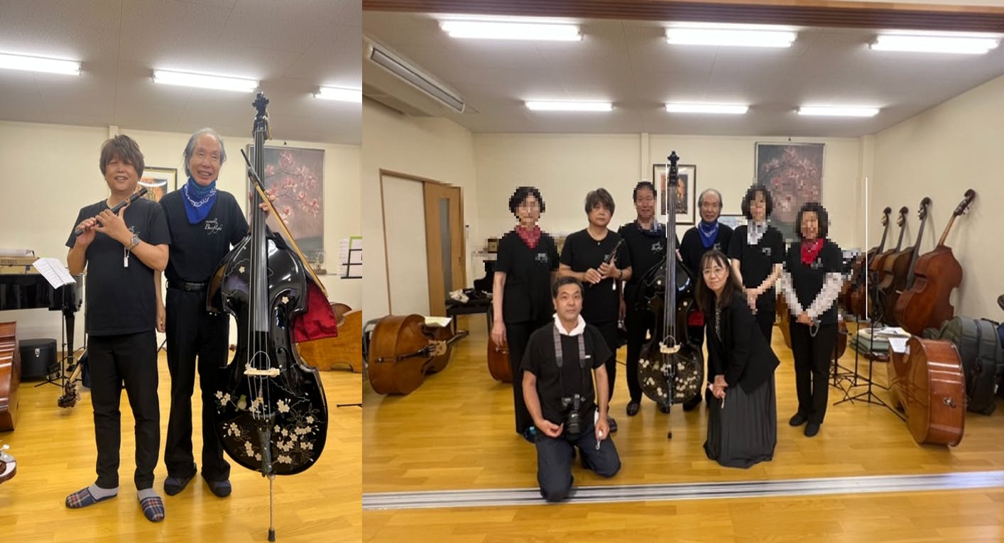 京都→宇治→寺院が多い→雅楽???と単純な連想ゲーム・・・汗「あ!龍笛の先生近くに居た!!」「あのぉ~~~分解できる漆のコントラバスと龍笛でセッションしませんか?」「喜んで!!!!」と、あっという間に練習が始まることになるのでした。