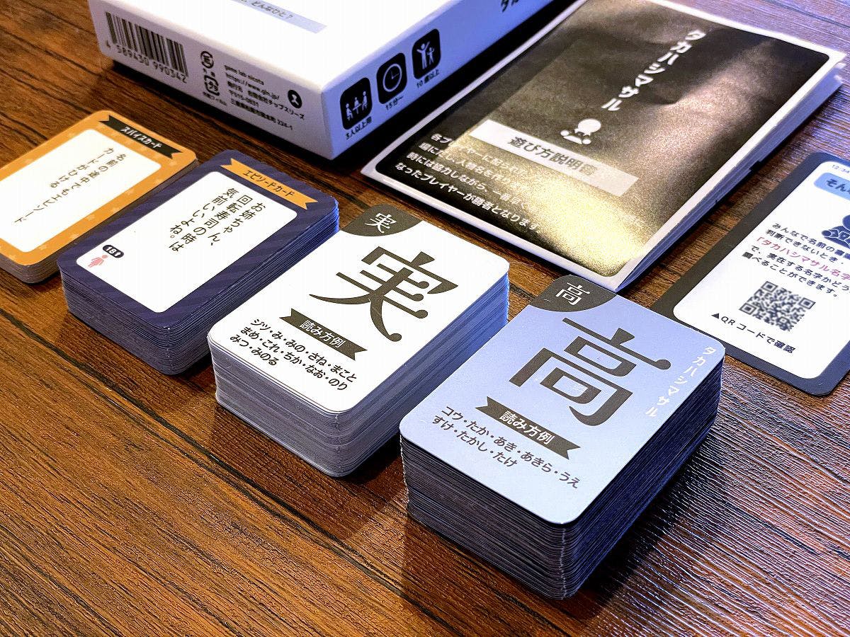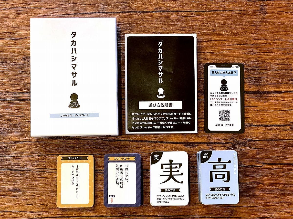 「タカハシマサル」は、プレイヤーに配られる7枚の名前カードを駆使し、他プレイヤーと協力し「実在する名字」と「ありそうな名前」を組み合わせながら、誰よりも早く手札をなくすことを目的としたゲームです。