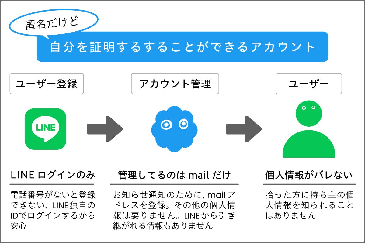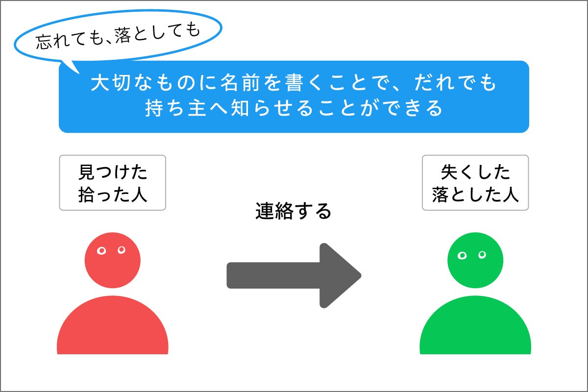 “大切な物に名前「ユーザー名(ID)」を書く”ことで、忘れものや落としものの持ち主を見つけ出せる。