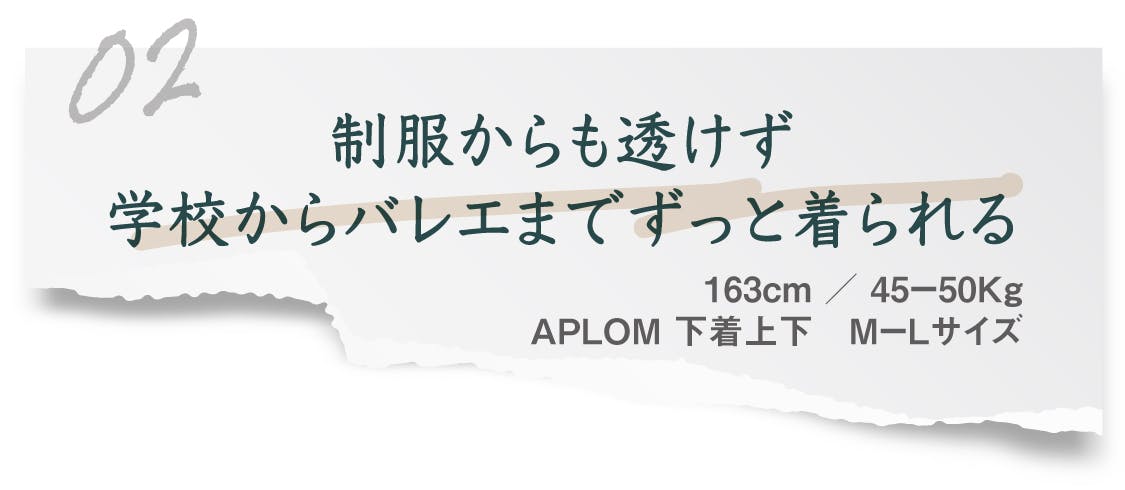 習い事でバレエを習っていますが、男性と踊る際、ベージュの下着がレオタードからはみ出るのが気になって集中できないことがありました。APLOMのショーツは色が薄く、カットもレオタードから出ないように作られているので、ストレスなくレッスンに望めて嬉しいです!レッスンのある日はバレエ用のショーツも持って出かけなければいけませんでしたが、朝から学校にAPLOMの下着を履いて行き、そのままバレエに行けるのでとても楽になりました。ベージュやピンクの色は制服からも透けないのが嬉しいです。色の選択肢も多いので、他の色も購入してみたいと思います。