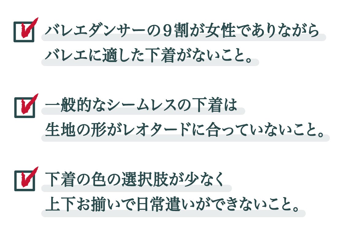 その中で自分の経験からも、もっとバレエ用のインナーって改善の余地があるのではないかとみんなが気になっていたこと。