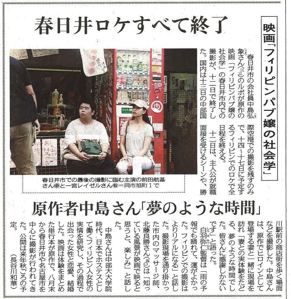 この映画には原作があります。原作者の中島弘象さんは愛知県春日井市で生まれ育ち、市内にある大学の大学院在学中に国際関係学を専攻されていました。修士論文のテーマとして、在日フィリンピン人女性の現状を調べていくうちにご自身が体験されたことを、ルポルタージュという形で2017年2月に『フィリピンパブ嬢の社会学』(新潮新書)として出版されました。