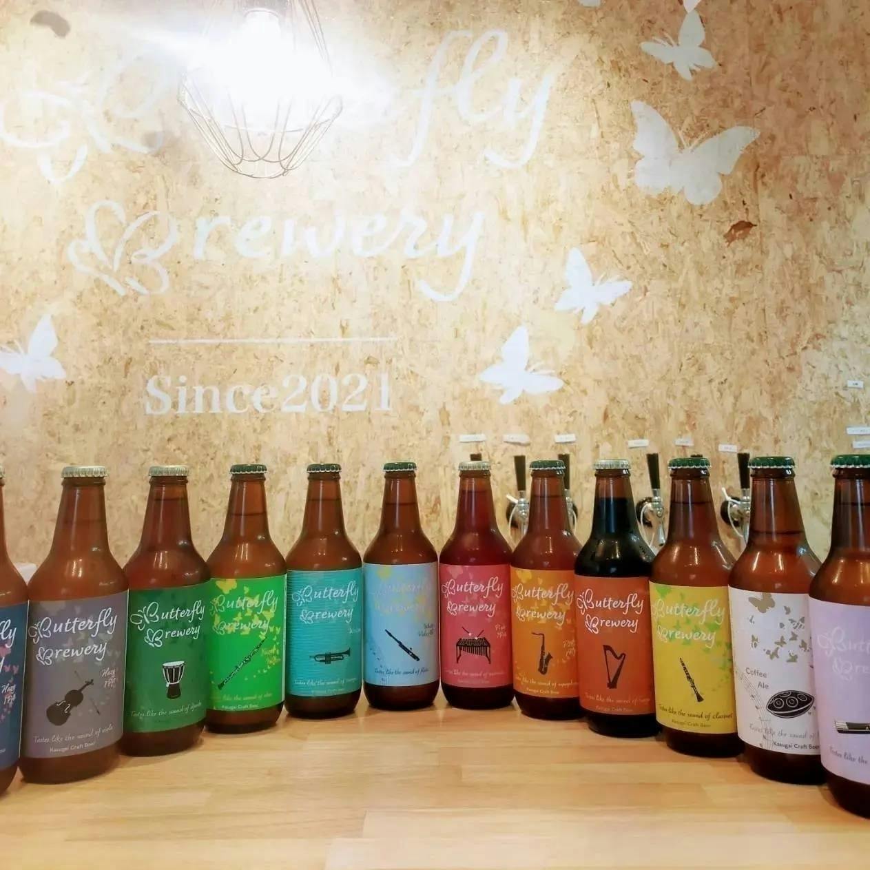 バタフライブルワリーは、2021年11月に愛知県春日井市に誕生しました。醸造設備の到着が大幅に遅れるというハプニングもありつつ、2022年8月より自家醸造を開始しました。バタフライブルワリーのビールは楽器名が商品名になっています。フルート奏者であった店主入谷の妻(高嶋光江 音楽家としては旧姓で活動)のアイデアでこの楽器シリーズが生まれました。美味しいビールが飲めて、コンサートも出来る場所を、と考えた妻との夢でありましたが、妻は突然、病により2020年11月に他界しました。残された2人の幼い娘達の側で仕事をしたいという思いから、家の敷地内にバタフライブルワリーを作りました。妻とは飲食スペースやコンサートスペースも作りたいと話していましたが、店主1人で始めることになったため計画を縮小し、醸造所と、併設の直売所のみでスタートしました。現在は醸造担当として学生時代からの親友の玉城仁志を迎え、一歩一歩、夢の続きを歩んでおります。