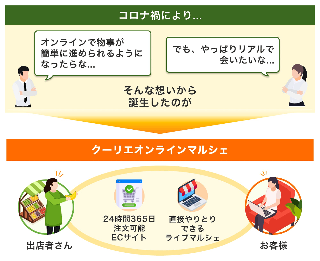私たちは、どんな時でもマルシェのワクワク感や笑顔溢れる雰囲気を体験でき、皆様の笑顔が生まれる環境を作るために、「クーリエオンラインマルシェ」のプロジェクトを立ち上げました。