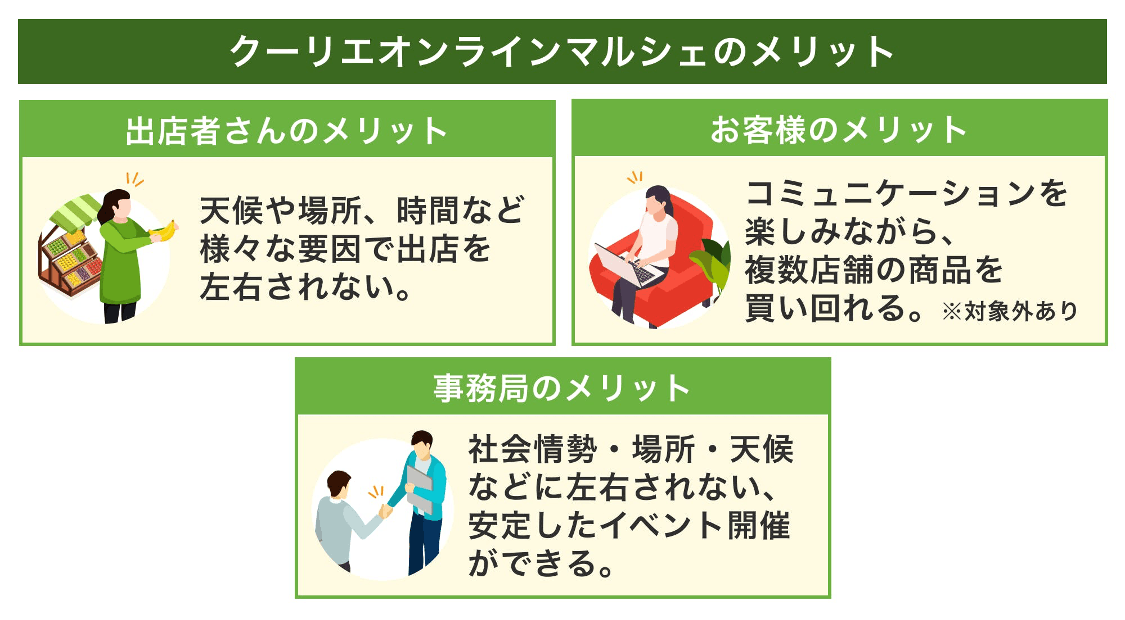 また、マルシェの運営側であるクーリエとしても、オンラインで開催をすることで、開催場所やテントやテーブルなどの備品の確保というハードルがなく、安定したマルシェの開催が可能です。