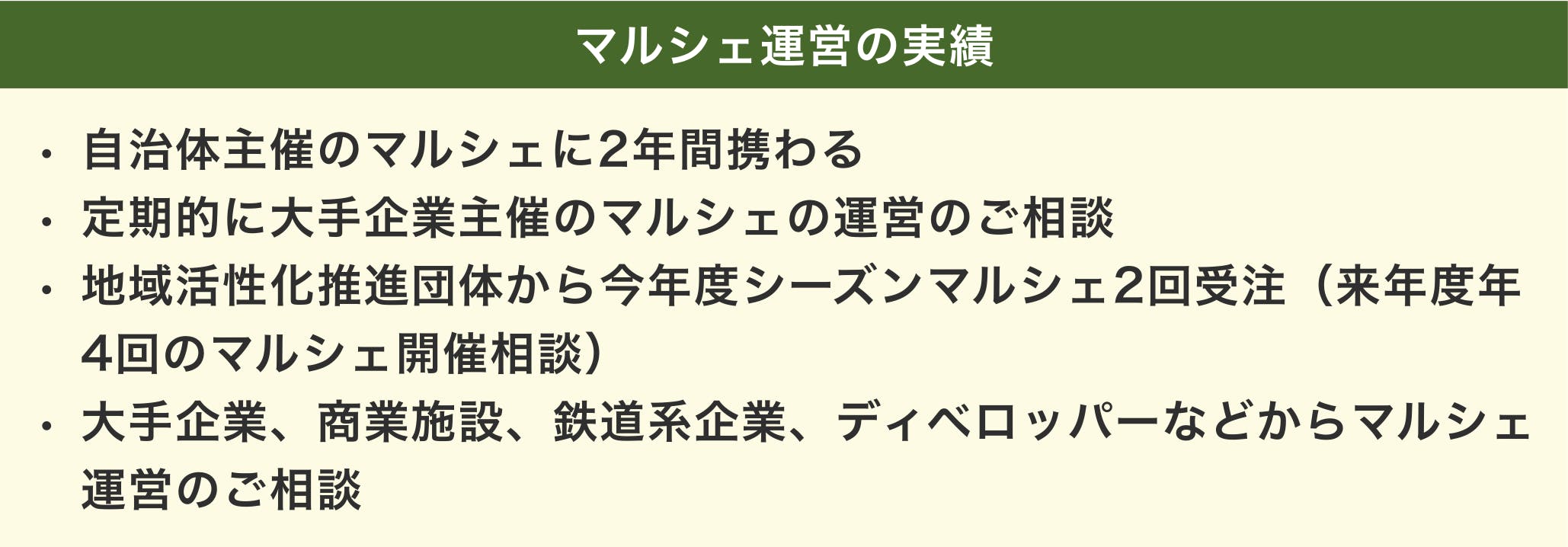 この他にも、横浜北仲マルシェやいそご丘の上マルシェなど、定期開催マルシェの企画運営に関わる他、東京都内の自治体主催のマルシェイベントなど、行政を巻き込んだマルシェに関わった経験もあります。