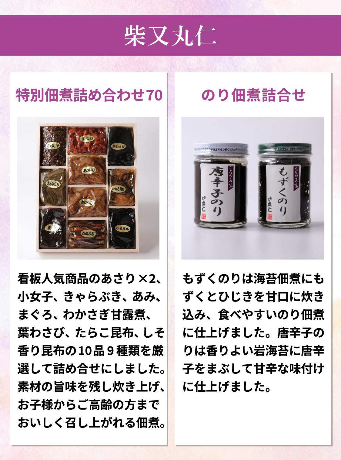 ①【小女子佃煮】小女子(北海道産)、砂糖、醤油、還元水飴、発酵調味料、寒天、(一部に小麦・大豆を含む) ②【きゃらぶき】きゃらぶきカット塩漬け(国内製造)、醤油、砂糖、ぶどう糖果糖液糖/調味料(アミノ酸)、保存料(ソルビン酸K)、(一部に小麦・大豆を含む) ③【あみ佃煮】あみ(霞ヶ浦産)、醤油、砂糖、還元水飴、(一部に小麦・大豆を含む) ④【葉わさび】塩漬け葉わさび(中国製造)、青菜、醤油、砂糖、芋づる、食塩、唐辛子、かつお風味調味料/ソルビット、香料、調味料(アミノ酸等)、酸味料、保存料(ソルビン酸K)、(一部に小麦・大豆) ⑤【まぐろ大和煮】まぐろ加工品(国内製造)、水飴、醤油、砂糖、生姜、寒天/調味料(アミノ酸)、(一部に小麦・大豆を含む) ⑥【たらこ昆布】スケトウダラ卵(中国産)、昆布、砂糖、醤油、還元水飴、食塩、寒天/着色料(黄色4号・黄色5号・赤色102号)、(一部に小麦・大豆を含む) ⑦【あさり佃煮】ボイルあさり(中国製造)、醤油、砂糖/(一部に小麦・大豆を含む) ⑧【しそ香り昆布】昆布(北海道産)、醤油、還元水飴、砂糖、しその実、水飴、ごま、発酵調味液、たん白加水分解物、鰹節調味液、食用油脂、寒天/調味料(アミノ酸等)、着色料(カラメル色素)、pH調整剤、甘味料(甘草・ステビア)、保存料(ソルビン酸K)、酒精、増粘多糖類、香料、(一部に小麦・ごま・大豆を含む) ⑨【わかさぎ甘露煮】わかさぎ(国産)、砂糖、醤油、寒天、(一部に小麦・大豆を含む)