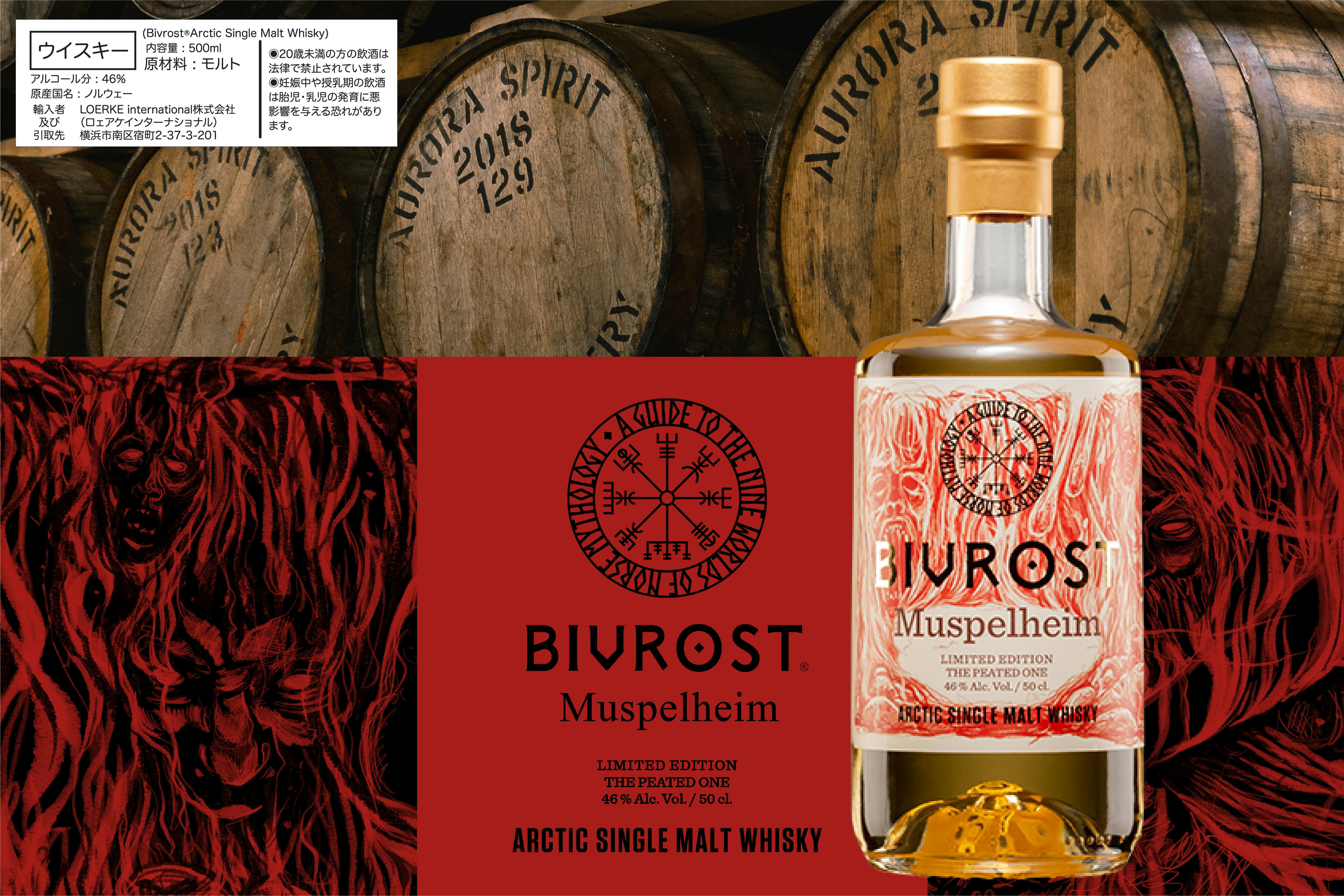 北緯69°のノルウェーの雄大なリンゲンアルプスの麓にあるオーロラの輝きの下で手作りされる、オーロラ・スピリット蒸溜所の「北欧神話の9つの世界」シリーズの3番目のウイスキーであるBIVROSTムスペルハイム北極シングルモルトウイスキー。 北欧神話に登場する、世界の創めから存在し、あまりの暑さゆえムスペルハイムで生まれた者以外はムスペルハイムで暮らすことはできないとされる、そんな世界の南の果てにある灼熱の巨人の国「ムスペルハイム」をイメージしたスモーキーなウイスキーは、ピート大麦とリンゲンアルプスの氷河の融解水から作られ、ハイテク蒸留器で蒸留された後バーボンと元アイラの樽で熟成される。