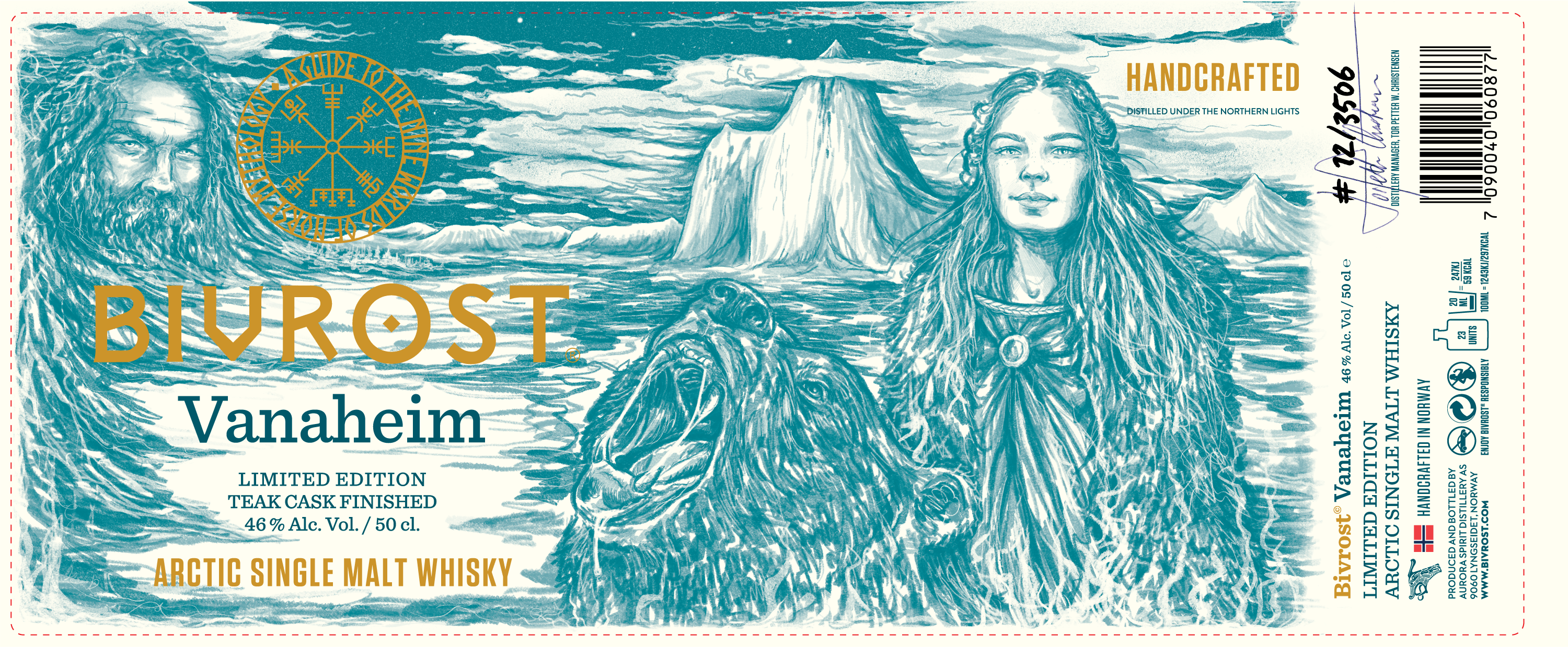 今も北欧の各地にはニョルズの名を冠した多くの地名が存在する。それは人々の信仰心を表しており、いかに神ニョルズが人々に愛され崇拝されていたかを見ることができる。そんな海の神としても名高いニョルズの故郷「ヴァナハイム」をイメージしたウイスキーは、透明感のある海の中のような美しいブルーグリーンをベースに、屈強な体格の神々しいニョルズがメインで描かれた専用のボックスに入っており、同じブルーグリーンのラベルにも静かな強さと知恵を秘めた瞳が印象的なニョルズが描かれている。海の中に差し込む太陽の光を集めたかのように黄金色に輝くヴァナハイムウイスキーは、チーク樽の影響により非常にトロピカルなフレーバーを持つ、甘く心地よい余韻がいつまでも味わっていたいと思わせる美味しくて飲みやすいウイスキーと仕上がっている。
