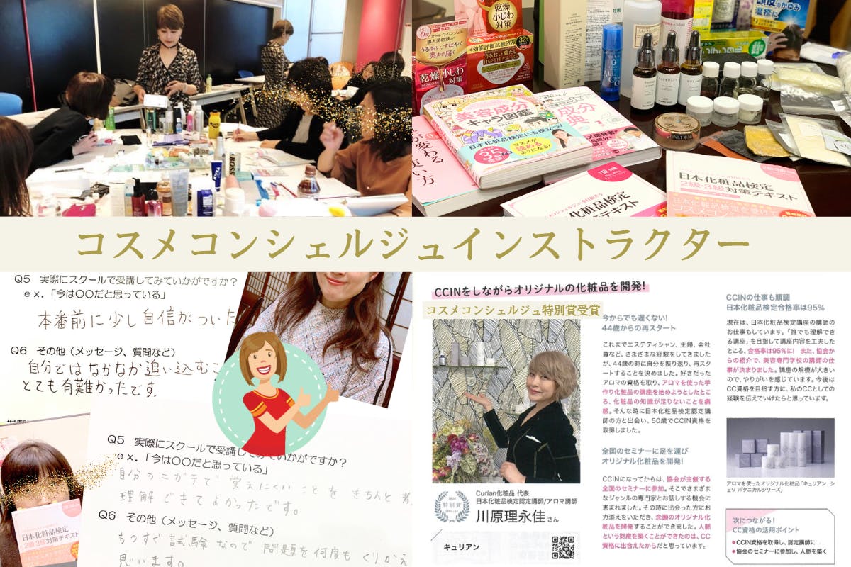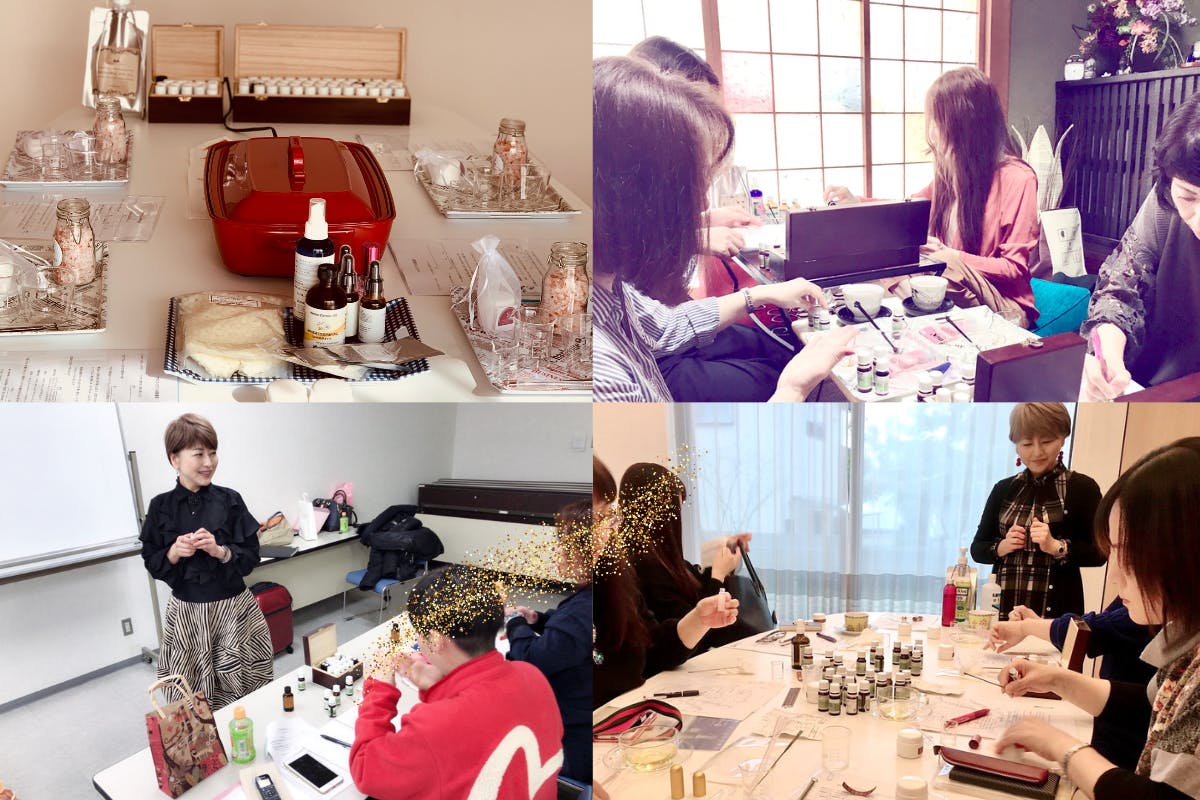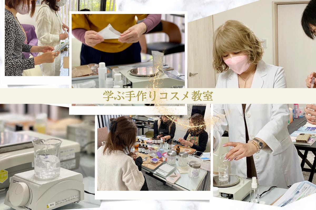 コスメコンシェルジュインストラクターとして日本化粧品検定資格取得の講座、化粧品がどうやってできているかを知っていただく為に学ぶ手作りコスメ教室、アロマで心に寄り添う香りづくり教室を開催しています。