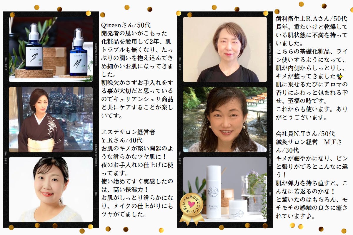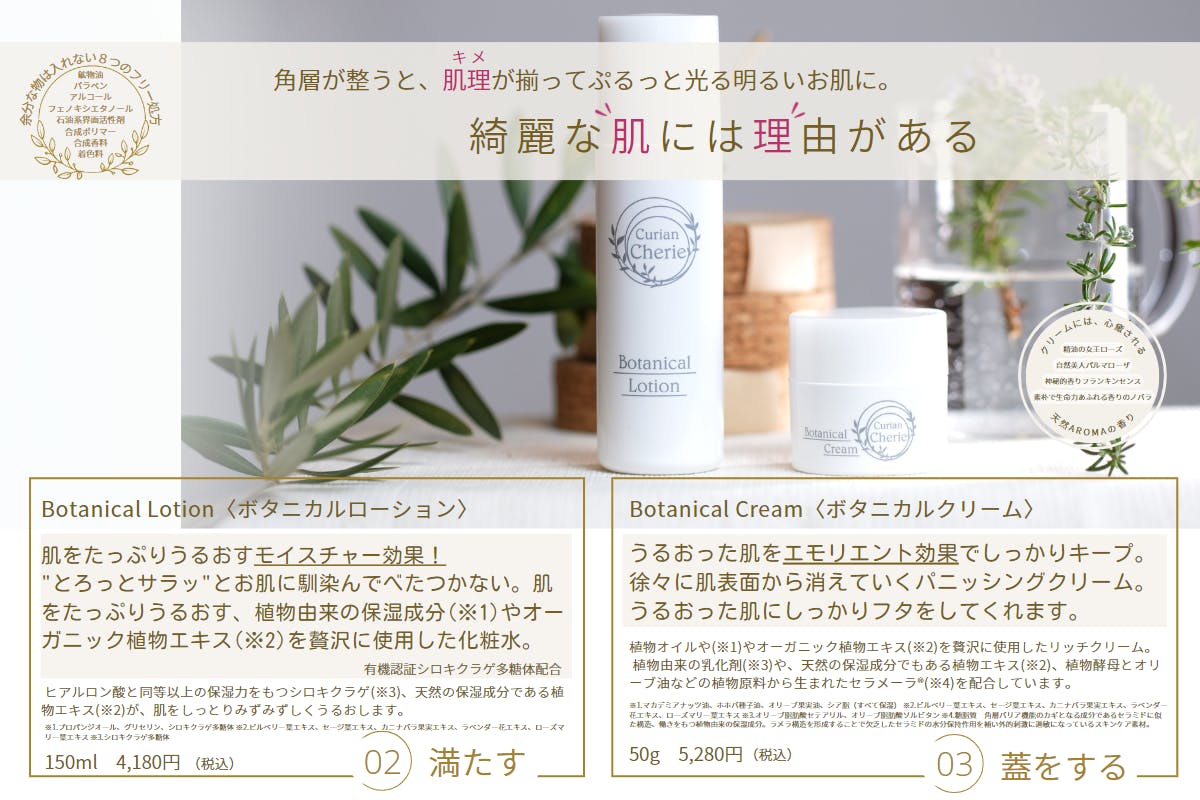 キュリアン シェリ ボタニカルクリーム<全成分>水、プロパンジオール、マカデミアナッツ油、水添ナタネ油アルコール、ホホバ種子油、グリセリン、オリープ油脂肪酸セテアリル、ペンチレングリコール、オリープ果実油、オリーブ油脂肪酸ソルビタン、シア脂、糖脂質、水添レシチン、ダマスクバライ油、ニュウコウジュ油、パルマローザ油、ノバラ油、シロキクラケ多糖体、ラベンダー花エキス、カニナバラ果実エキス、ビルベリー葉エキス、ローズマリー葉エキス、セージ葉エキス、安息香酸Na、トコフェロール、クエン酸、クエン酸Na、BG、エチルヘキシルグリセリン、キサンタンガム