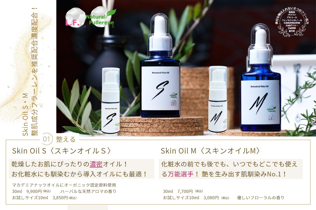 このスキンオイルシリーズは、水分と油分のバランスが大切な角層に、お肌の皮脂に近い植物油と、化粧品愛好者の中で有名なフラーレン、心の寄り添う香りの精油だけというシンプル設計!