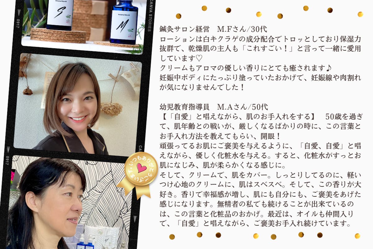 化粧品開発を決意した背景には、学んだことに自分の想いを込めて形にしたかった。そして私の手作りアロマ講座で作った化粧品を気に入ってくれている、僅かな方たちに届けたかったからです。