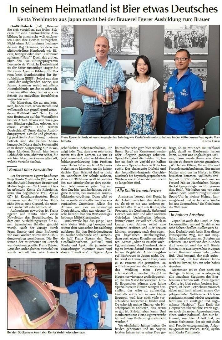 Im Namen meiner ganzen Familie Egerer und unserer langen Tradition verbürge ich mich für sein Wissen und seinen Fleiß. Aus grossem Herzen und mit voller Überzeugung weiss ich, dass Kenta mit seiner eigenen Brauerei in Japan viel Erfolg haben wird.