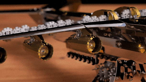 台座を兼ねたゼンマイが動力として飛行機全体の歯車を動かします。